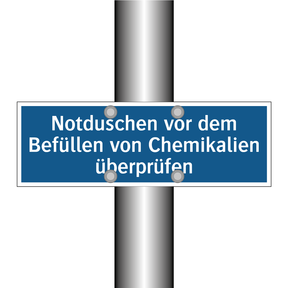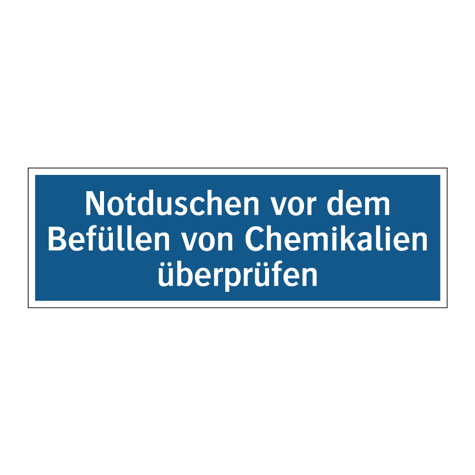 Gebotsschild mit dem Text Notduschen vor dem Befüllen von Chemikalien überprüfen