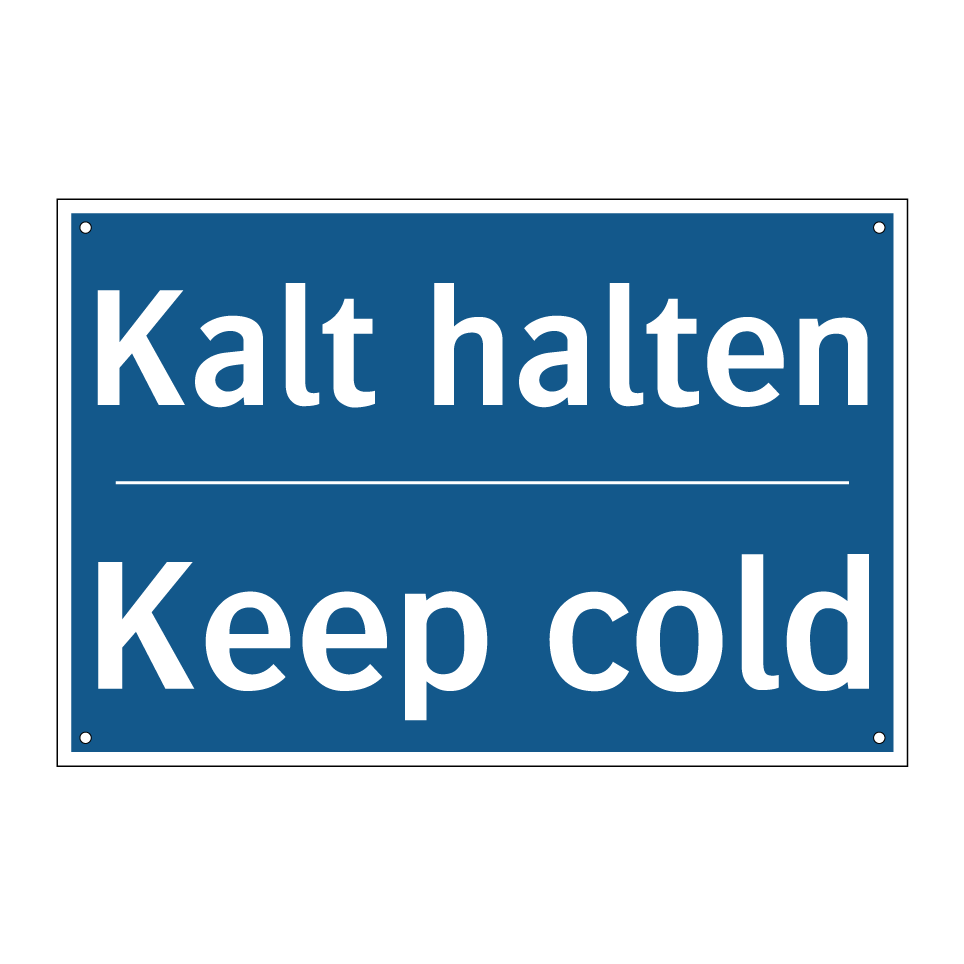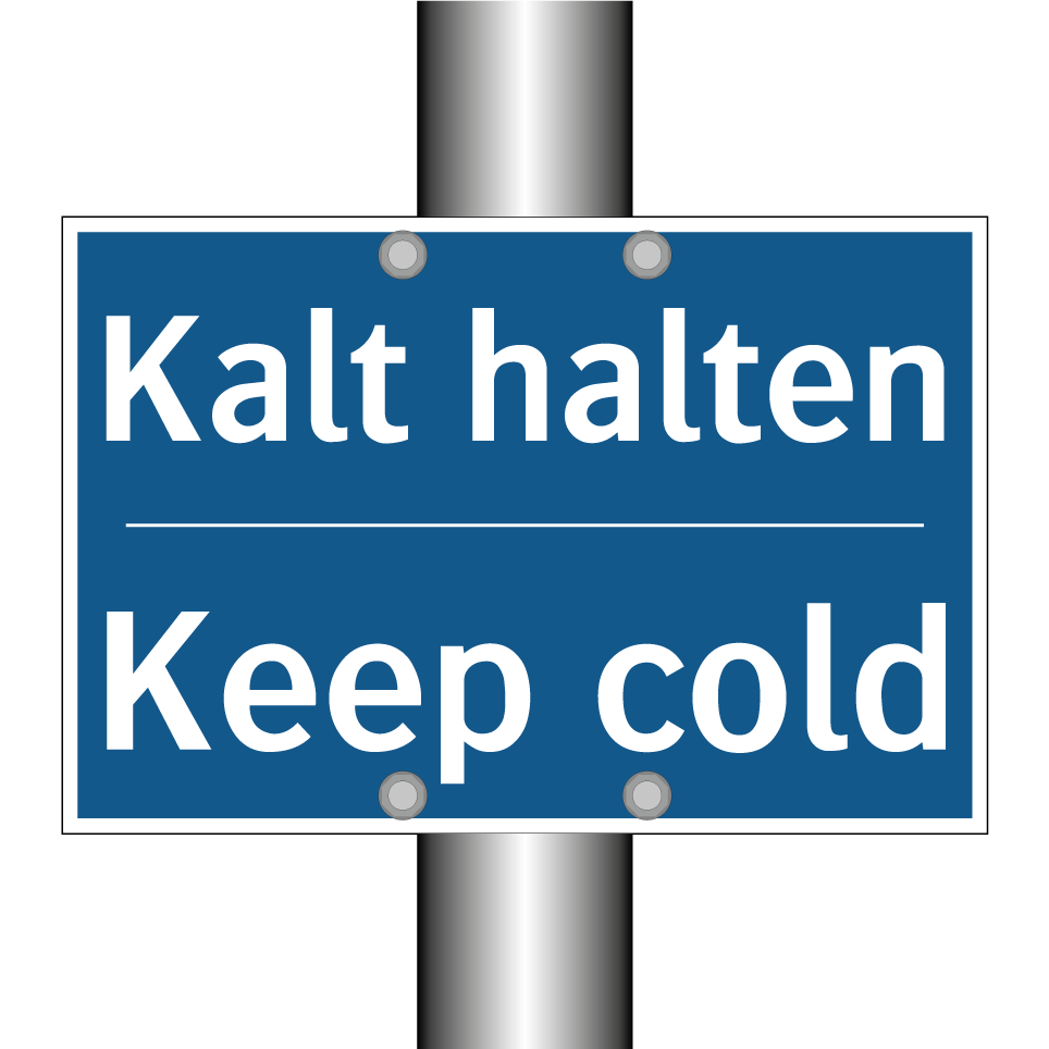 Zweisprachiges Verbotsschild mit deutschem Text Kalt halten und englischem Text Keep cold