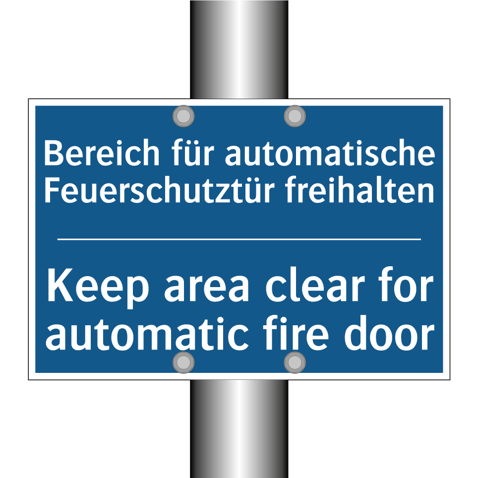Zweisprachiges Verbotsschild mit deutschem Text Bereich für automatische Feuerschutztür freihalten und englischem Text Keep area clear for automatic fire door