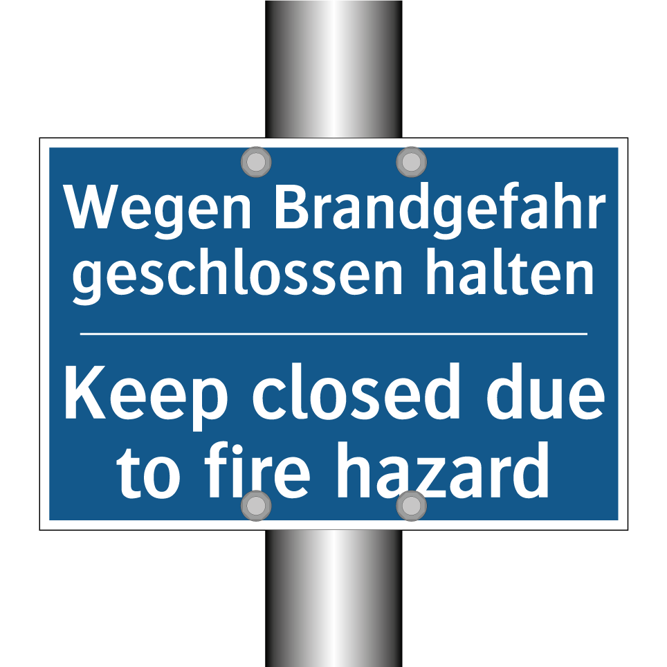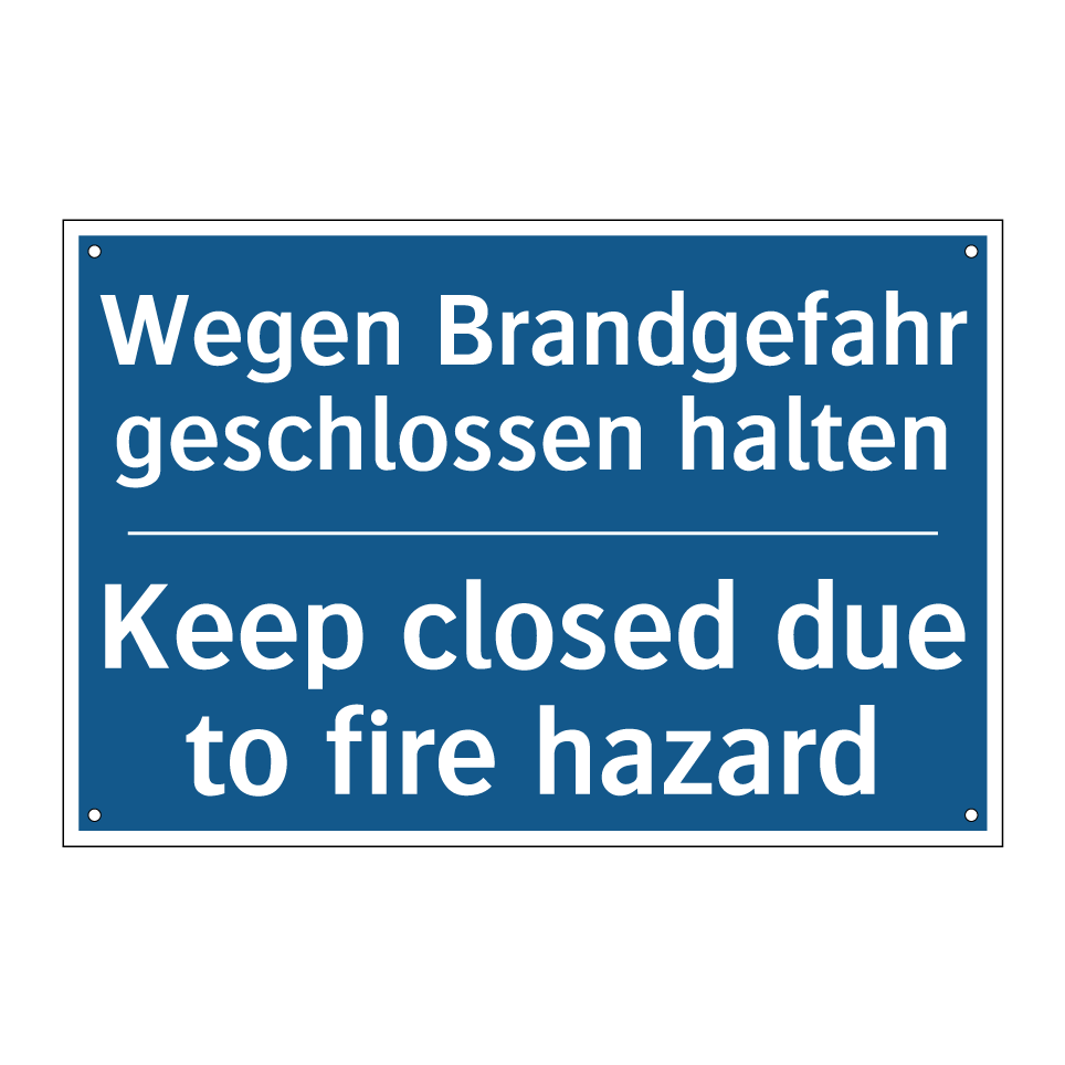 Zweisprachiges Verbotsschild mit deutschem Text Wegen Brandgefahr geschlossen halten und englischem Text Keep closed due to fire hazard