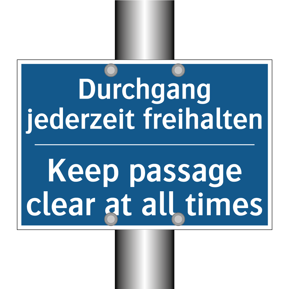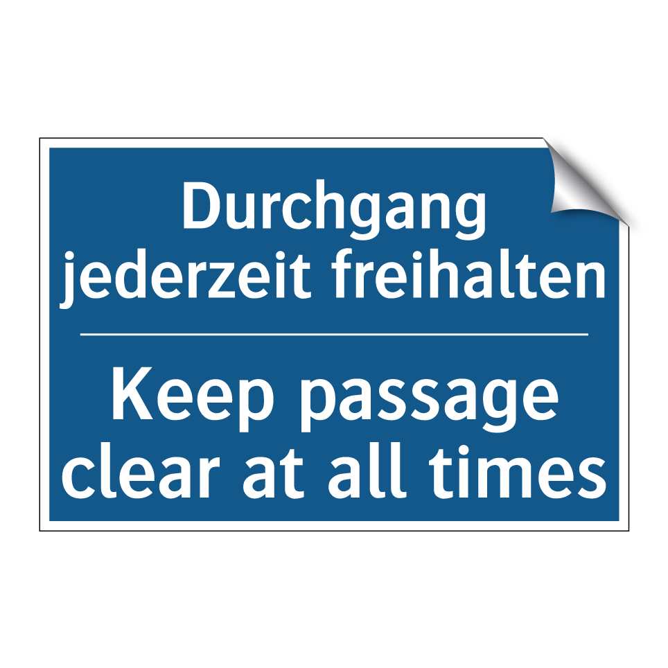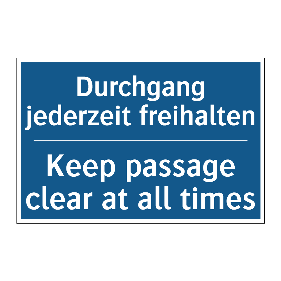 Zweisprachiges Verbotsschild mit deutschem Text Durchgang jederzeit freihalten und englischem Text Keep passage clear at all times