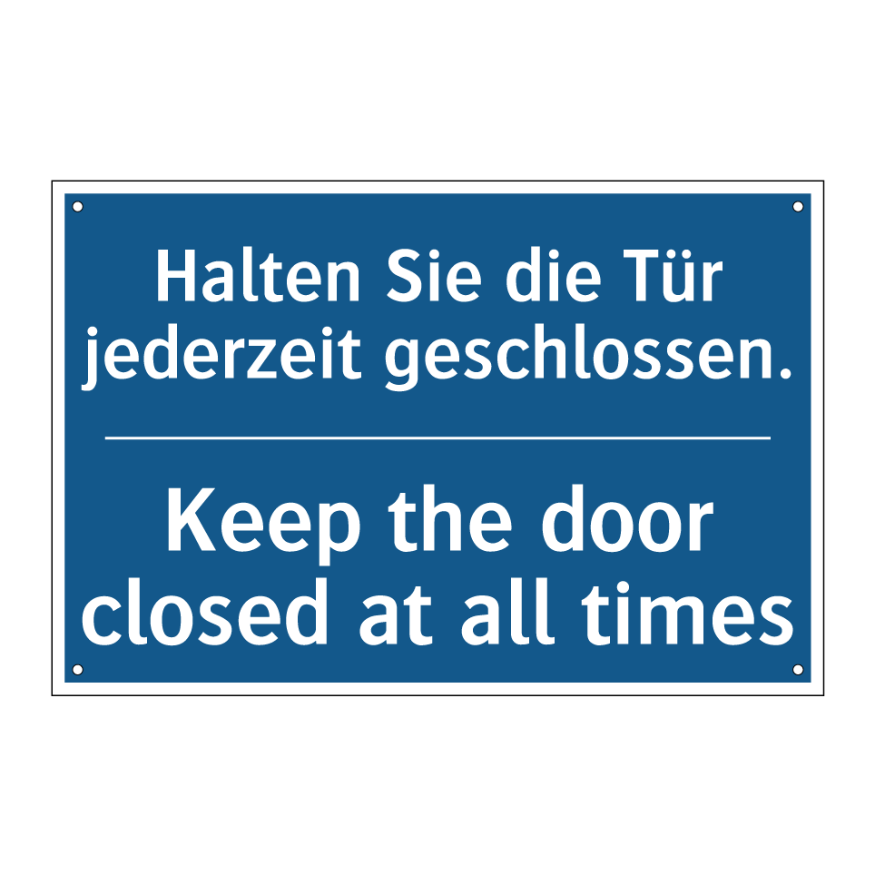 Zweisprachiges Verbotsschild mit deutschem Text Halten Sie die Tür jederzeit geschlossen. und englischem Text Keep the door closed at all times
