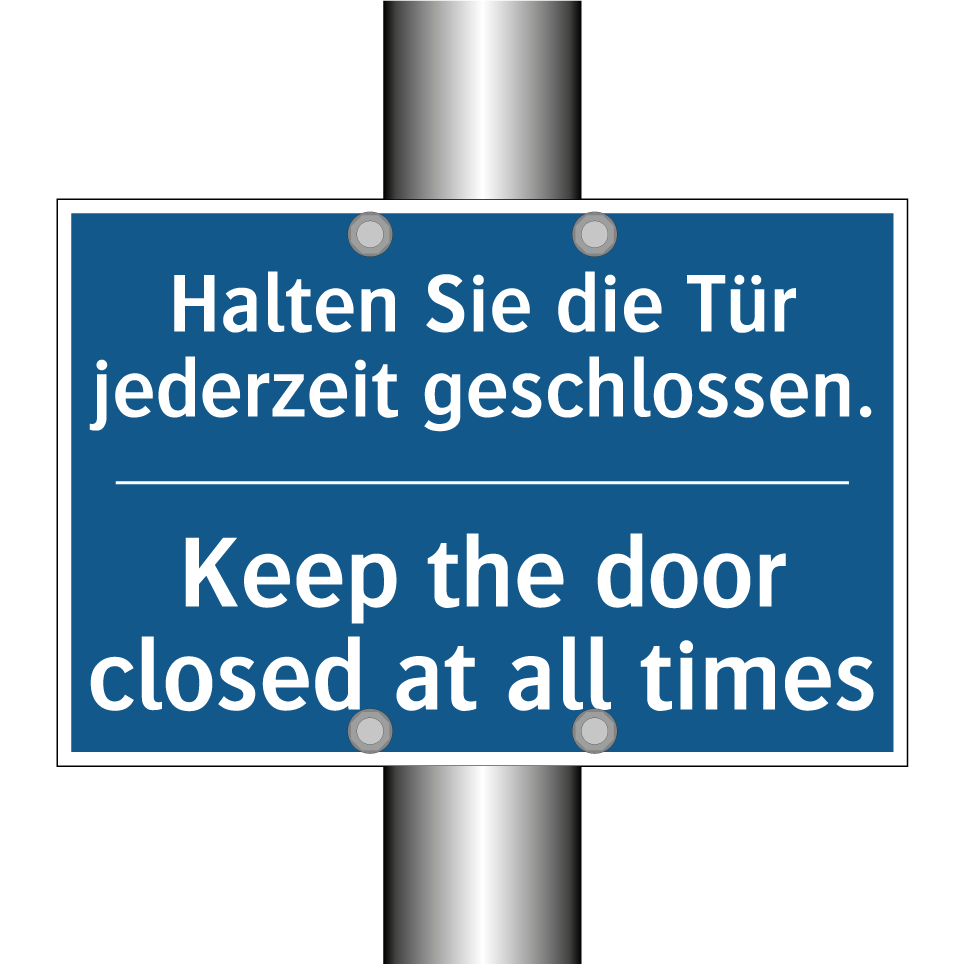 Diese Gebotsschild mit blauem Hintergrund und weißer Schrift ist ideal für den Einsatz in Bereichen, in denen Sicherheit und Ordnung oberste Priorität haben. Die zweisprachige Beschriftung auf Deutsch und Englisch sorgt dafür, dass sowohl deutsch- als auch englischsprachige Personen die Anweisung verstehen, was die Kommunikation in internationalen Umgebungen erleichtert. Diese Schilder sind besonders nützlich in Büros, Lagerhäusern, Produktionsstätten und anderen Einrichtungen, in denen Türen aus Sicherheits- oder Klimagründen stets geschlossen gehalten werden müssen. Durch die klare und prägnante Botschaft wird sichergestellt, dass alle Personen die Wichtigkeit des geschlossenen Haltens der Tür erkennen und befolgen.