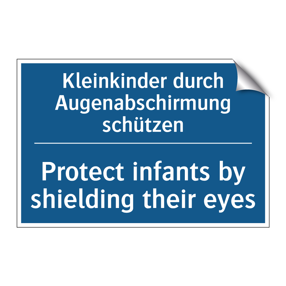 Zweisprachiges Verbotsschild mit deutschem Text Kleinkinder durch Augenabschirmung schützen und englischem Text Protect infants by shielding their eyes