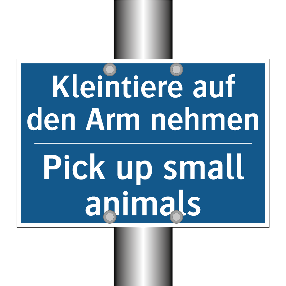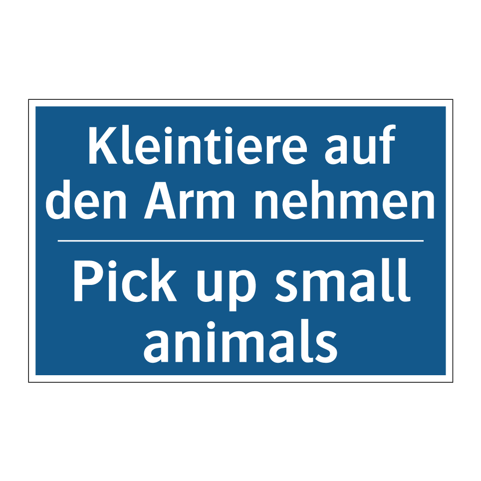 Diese Gebotsschild ist ideal für Orte, an denen der Schutz von Kleintieren oberste Priorität hat. Mit ihrer zweisprachigen Beschriftung auf Deutsch und Englisch ist sie besonders nützlich in internationalen Umgebungen, wie Zoos, Tierparks oder Tierhandlungen, wo Besucher aus verschiedenen Ländern erwartet werden. Die klare Anweisung, kleine Tiere auf den Arm zu nehmen, sorgt für ein sicheres und respektvolles Miteinander zwischen Mensch und Tier. Die blaue Hintergrundfarbe mit weißer Schrift sorgt für eine hohe Sichtbarkeit und Verständlichkeit. Diese Gebotsschild ist ein unverzichtbares Element, um die Sicherheit und das Wohlbefinden von Kleintieren zu gewährleisten.