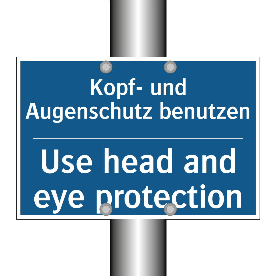 Zweisprachiges Verbotsschild mit deutschem Text Kopf- und Augenschutz benutzen und englischem Text Use head and eye protection