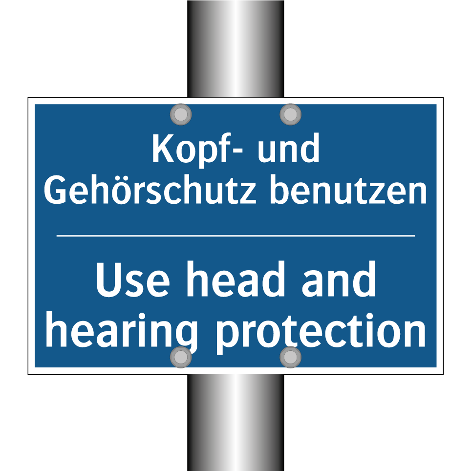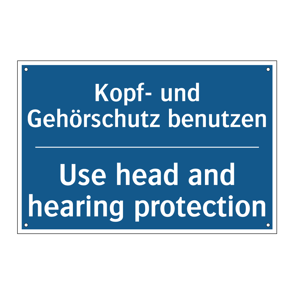 Zweisprachiges Verbotsschild mit deutschem Text Kopf- und Gehörschutz benutzen und englischem Text Use head and hearing protection