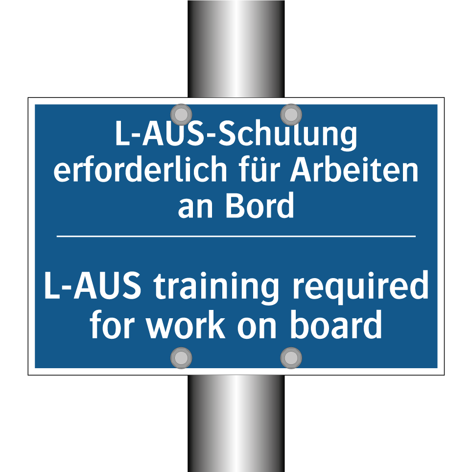 Zweisprachiges Verbotsschild mit deutschem Text L-AUS-Schulung erforderlich für Arbeiten an Bord und englischem Text L-AUS training required for work on board