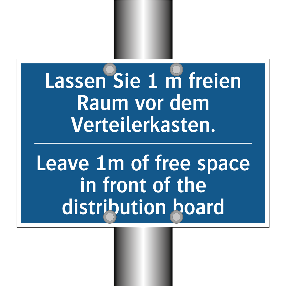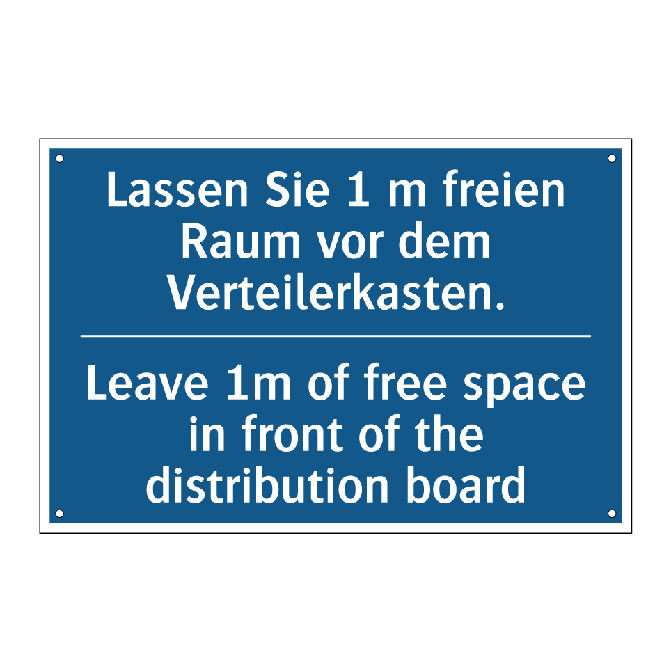 Zweisprachiges Verbotsschild mit deutschem Text Lassen Sie 1 m freien Raum vor dem Verteilerkasten. und englischem Text Leave 1m of free space in front of the distribution board
