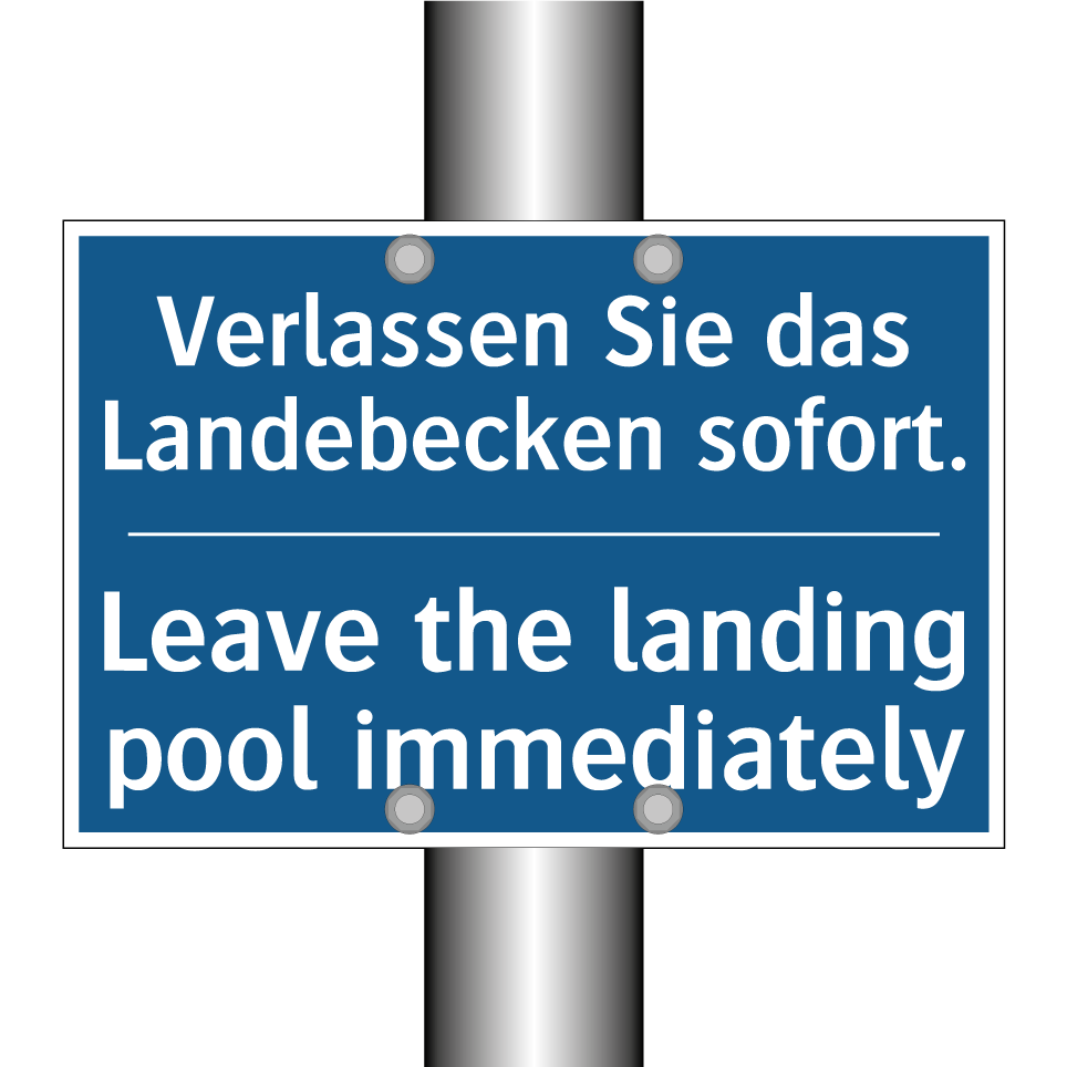 Zweisprachiges Verbotsschild mit deutschem Text Verlassen Sie das Landebecken sofort. und englischem Text Leave the landing pool immediately
