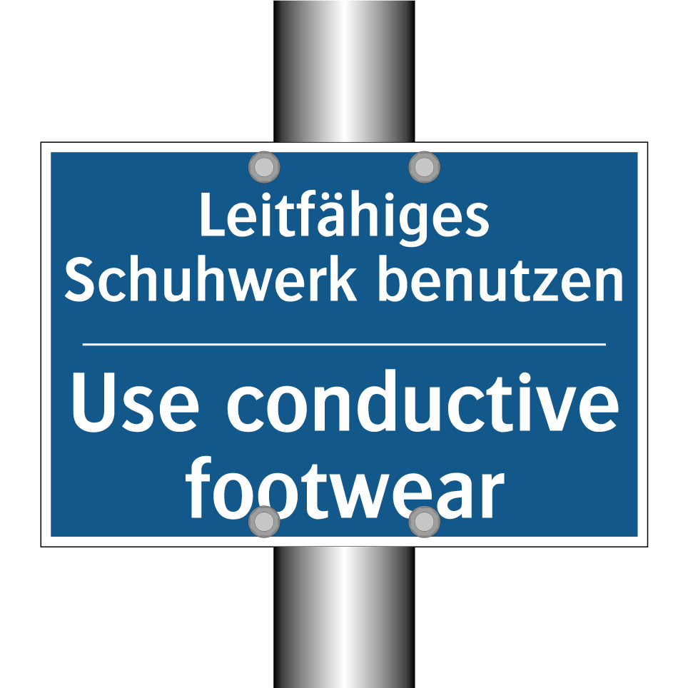 Entdecken Sie die Vielseitigkeit dieser Gebotsschild, die sowohl auf Deutsch als auch auf Englisch gestaltet ist. Diese zweisprachige Beschilderung ist ideal für internationale Arbeitsumgebungen, in denen Sicherheit an erster Stelle steht. Sie weist darauf hin, dass leitfähiges Schuhwerk getragen werden muss, um elektrostatische Entladungen zu vermeiden. Diese Gebotsschild ist perfekt für den Einsatz in Bereichen wie Produktionsstätten, Laboren oder anderen industriellen Umgebungen, in denen spezielle Sicherheitsmaßnahmen erforderlich sind. Die klare blaue Hintergrundfarbe mit weißer Schrift sorgt für eine hohe Sichtbarkeit und Verständlichkeit, was die Einhaltung der Sicherheitsvorschriften erleichtert.