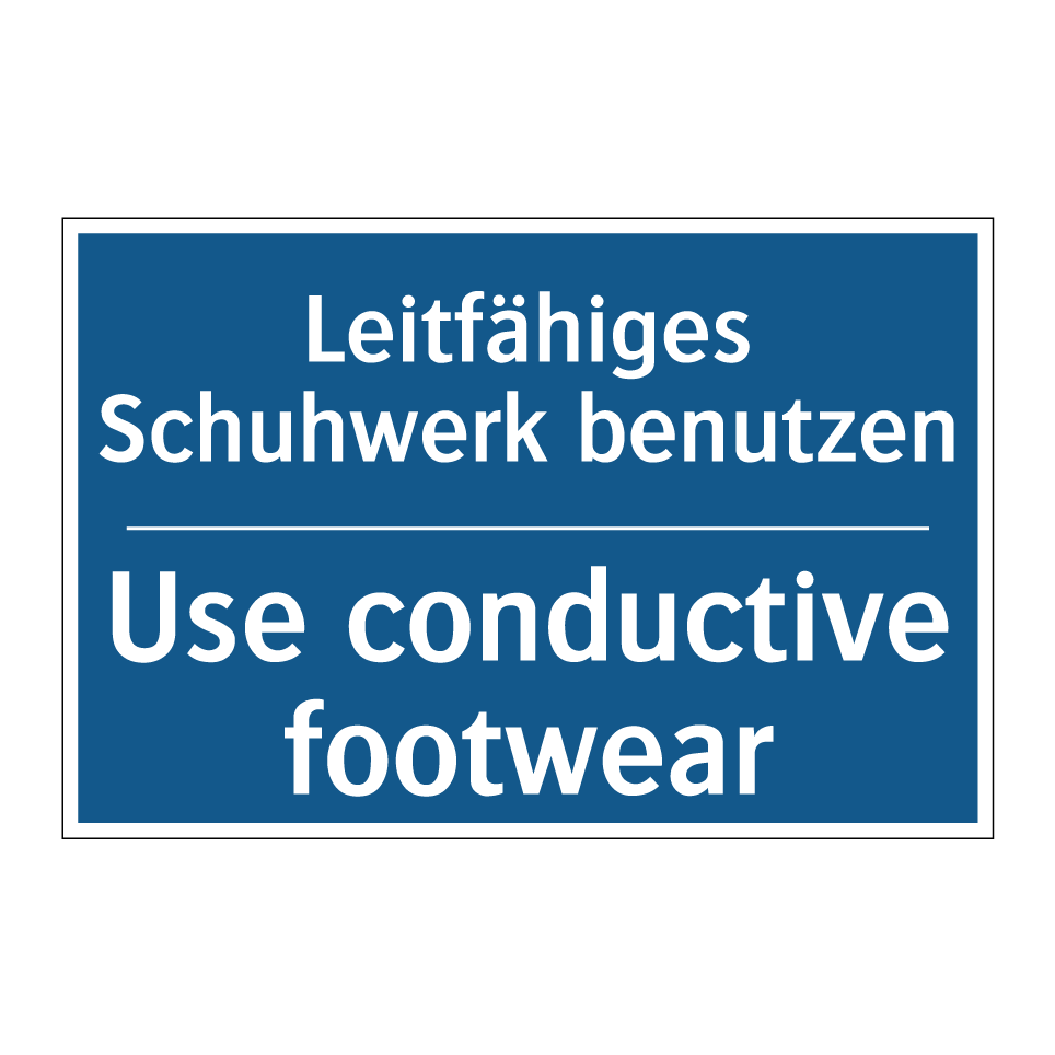 Zweisprachiges Verbotsschild mit deutschem Text Leitfähiges Schuhwerk benutzen und englischem Text Use conductive footwear