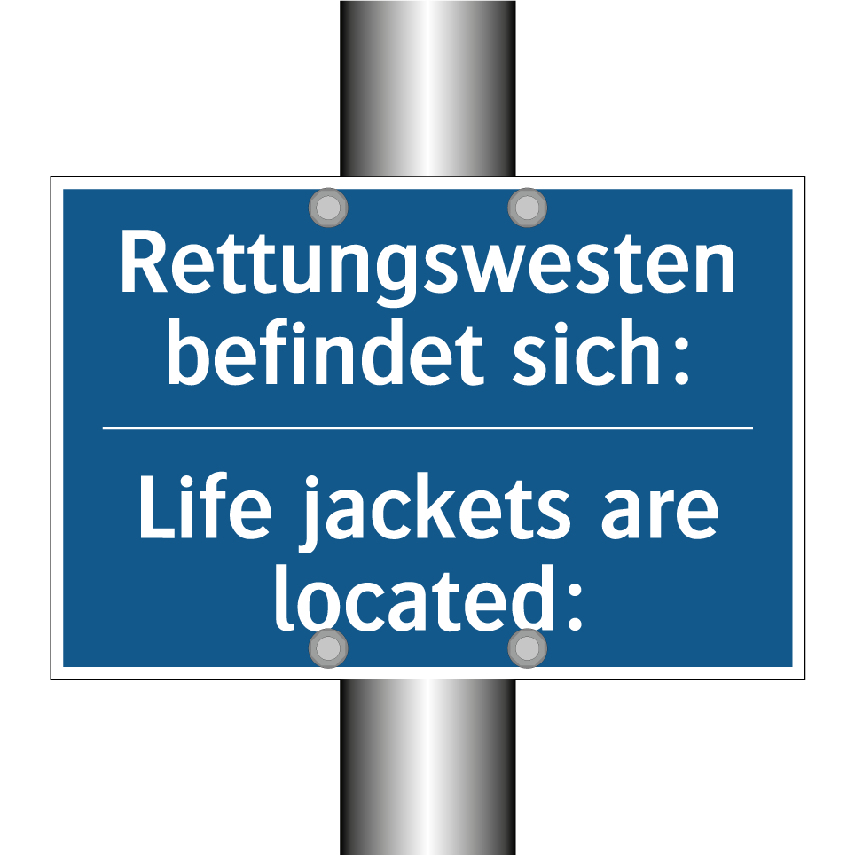 Zweisprachiges Verbotsschild mit deutschem Text Rettungswesten befindet sich: und englischem Text Life jackets are located: