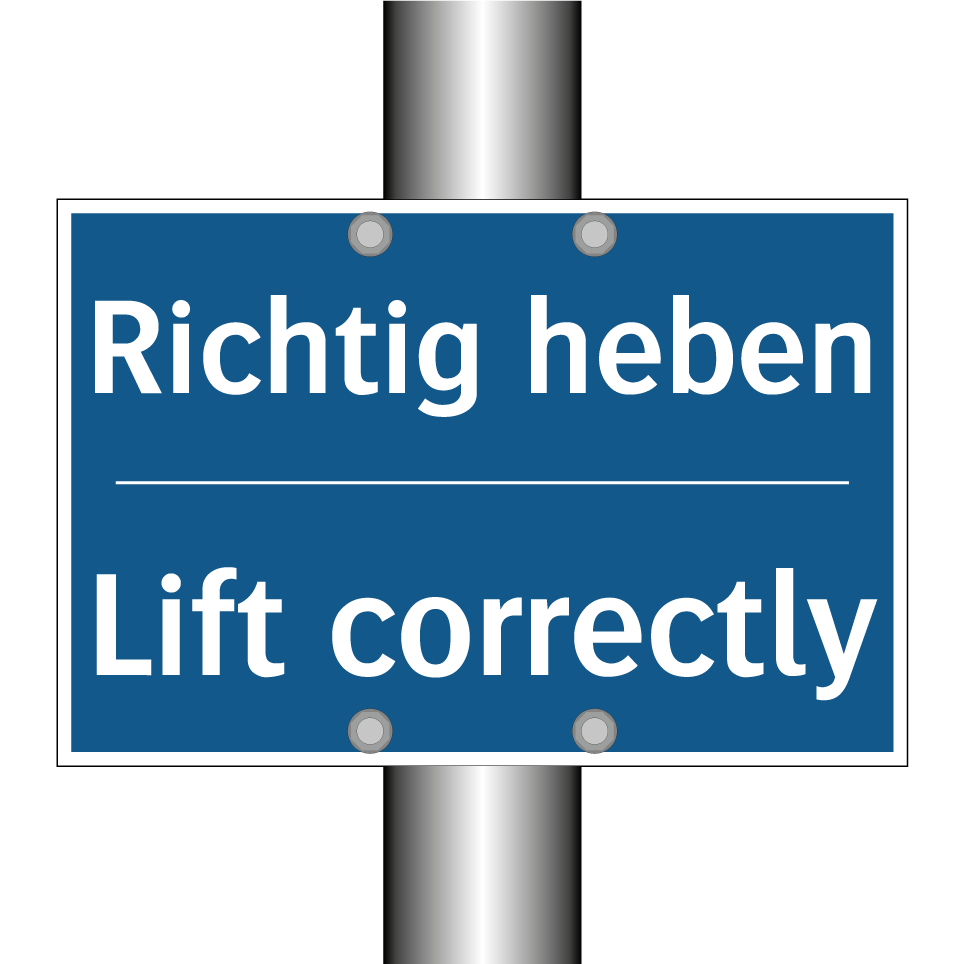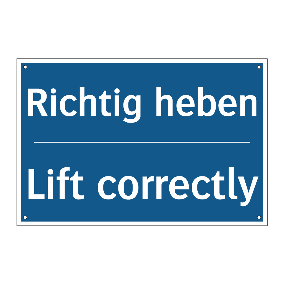 Zweisprachiges Verbotsschild mit deutschem Text Richtig heben und englischem Text Lift correctly