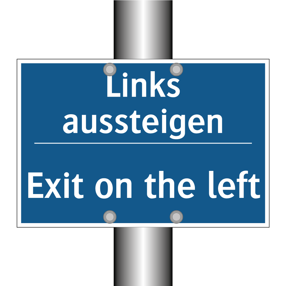 Zweisprachiges Verbotsschild mit deutschem Text Links aussteigen und englischem Text Exit on the left