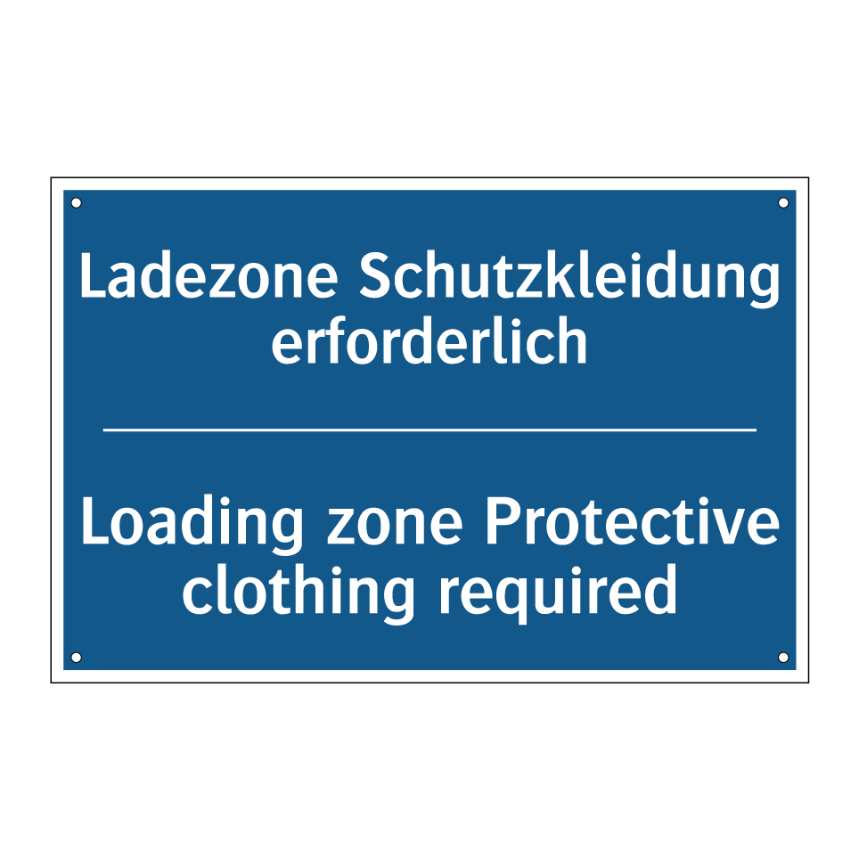 Zweisprachiges Verbotsschild mit deutschem Text Ladezone Schutzkleidung erforderlich und englischem Text Loading zone Protective clothing required
