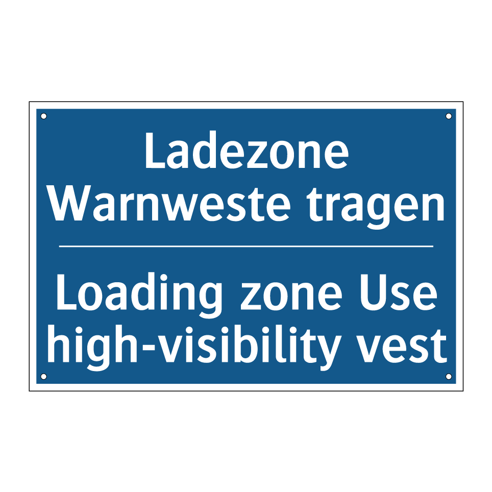 Zweisprachiges Verbotsschild mit deutschem Text Ladezone Warnweste tragen und englischem Text Loading zone Use high-visibility vest