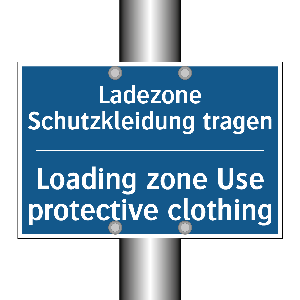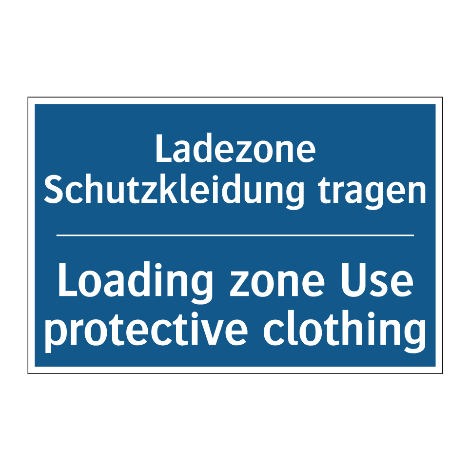 Zweisprachiges Verbotsschild mit deutschem Text Ladezone Schutzkleidung tragen und englischem Text Loading zone Use protective clothing