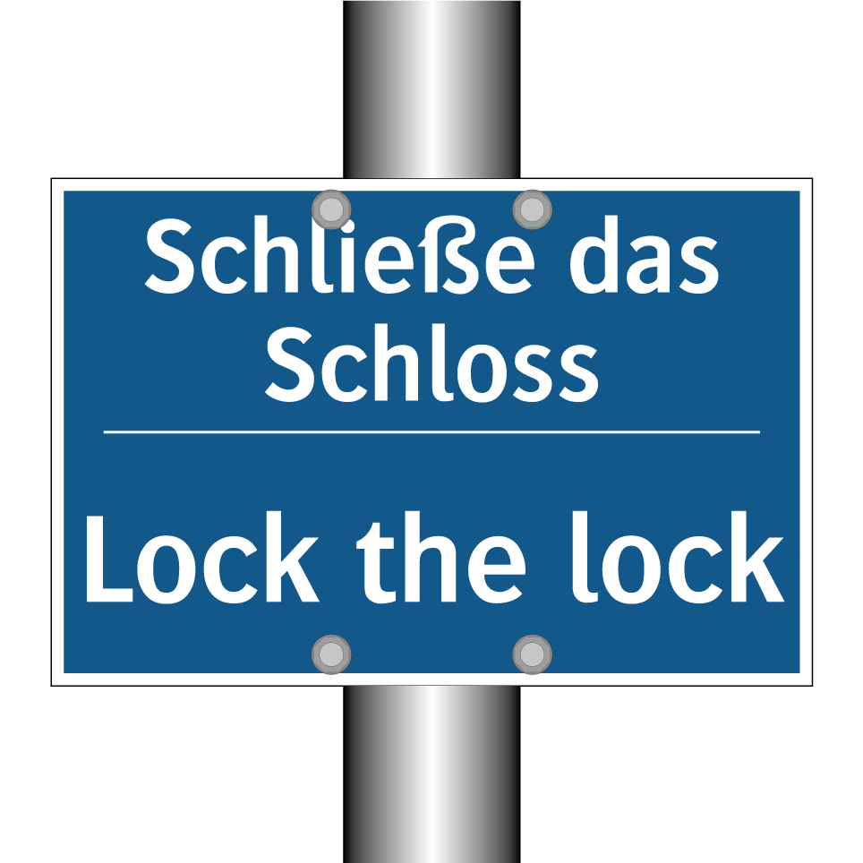 Zweisprachiges Verbotsschild mit deutschem Text Schließe das Schloss und englischem Text Lock the lock