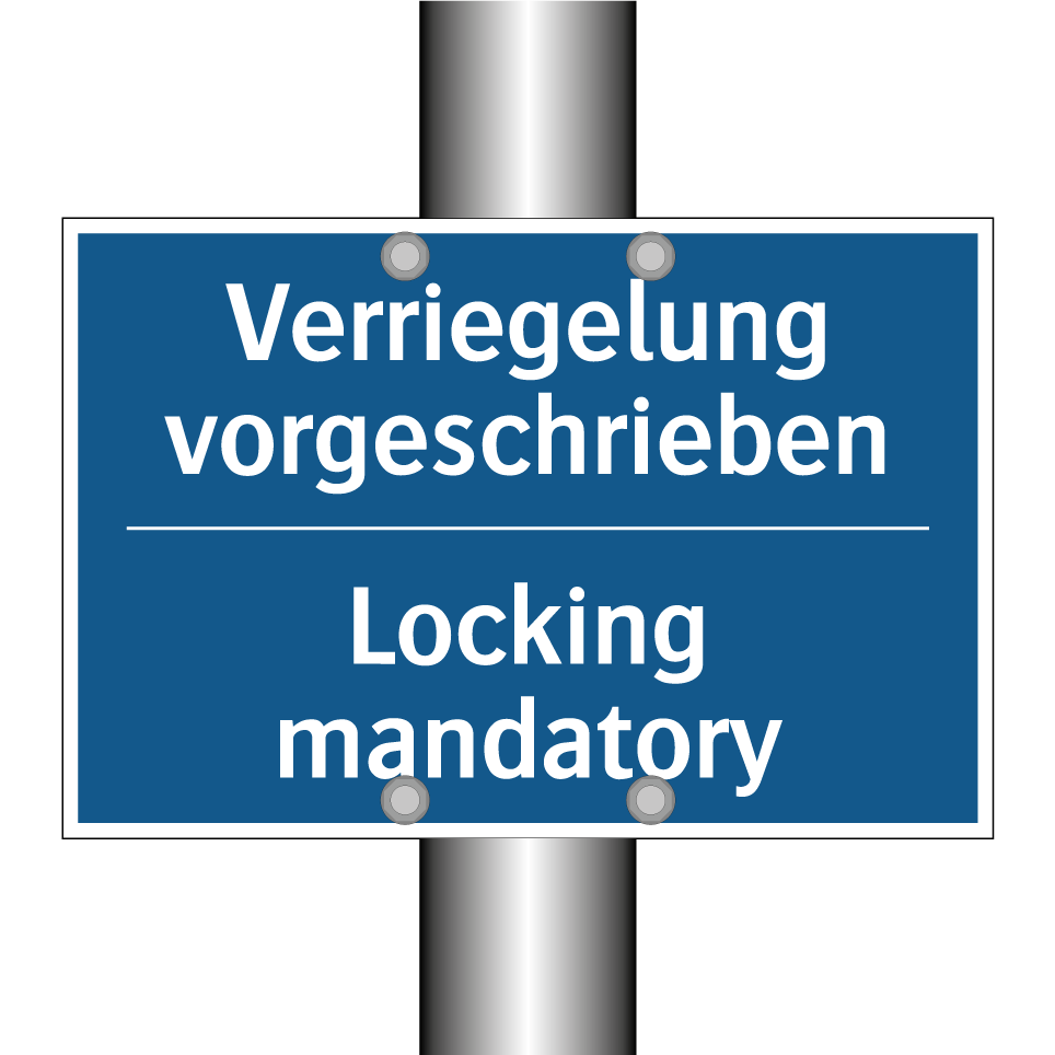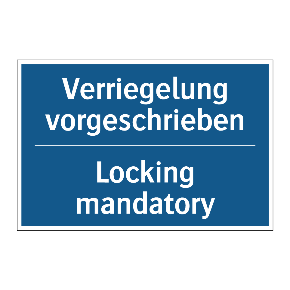 Zweisprachiges Verbotsschild mit deutschem Text Verriegelung vorgeschrieben und englischem Text Locking mandatory