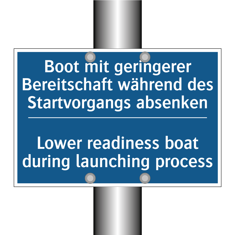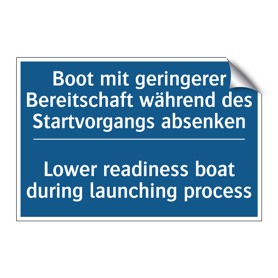 Zweisprachiges Verbotsschild mit deutschem Text Boot mit geringerer Bereitschaft während des Startvorgangs absenken und englischem Text Lower readiness boat during launching process