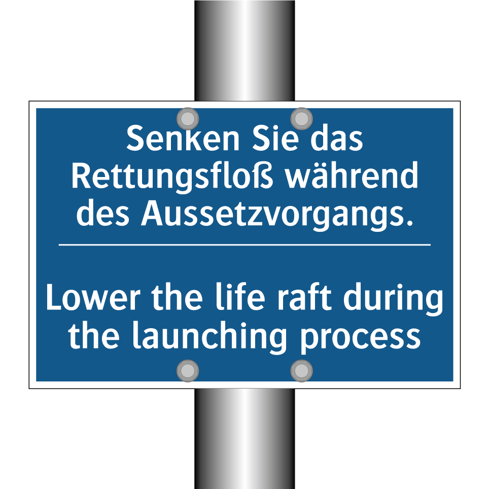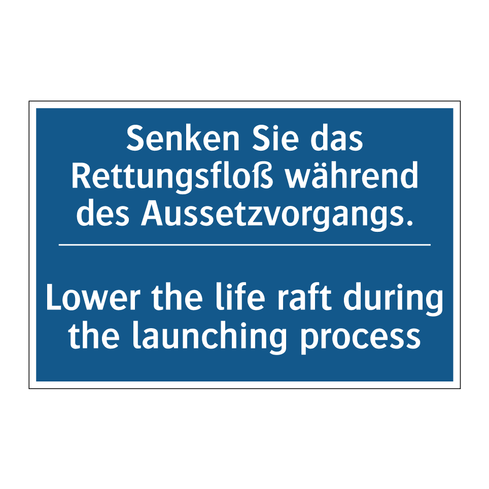 Zweisprachiges Verbotsschild mit deutschem Text Senken Sie das Rettungsfloß während des Aussetzvorgangs. und englischem Text Lower the life raft during the launching process
