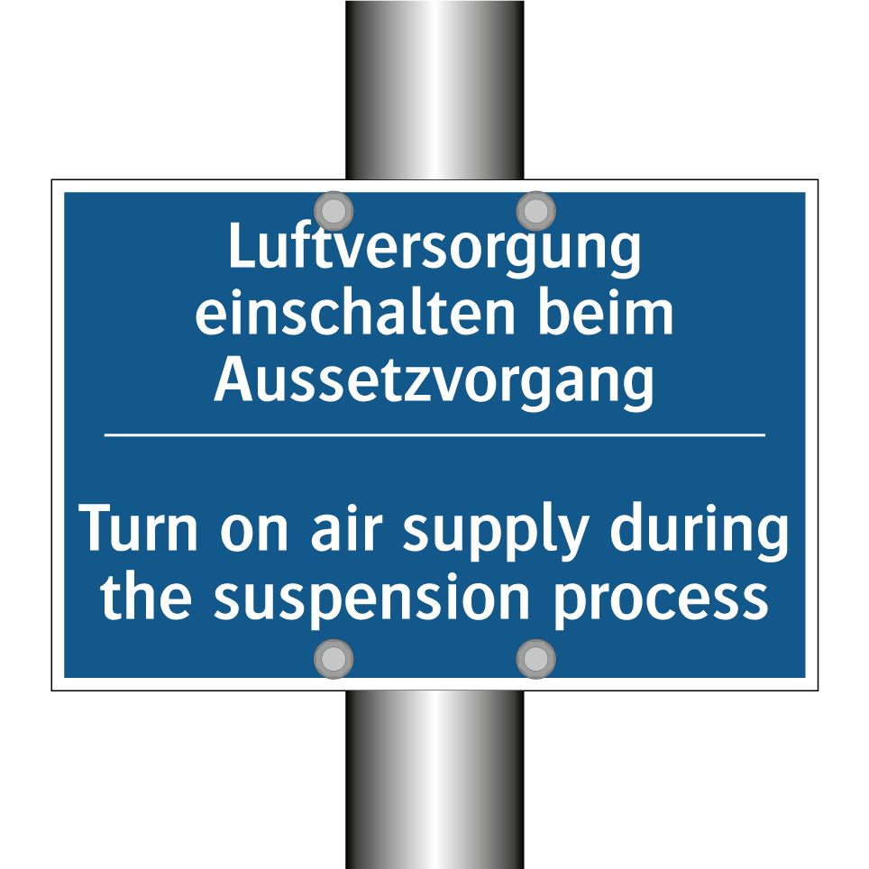 Zweisprachiges Verbotsschild mit deutschem Text Luftversorgung einschalten beim Aussetzvorgang und englischem Text Turn on air supply during the suspension process