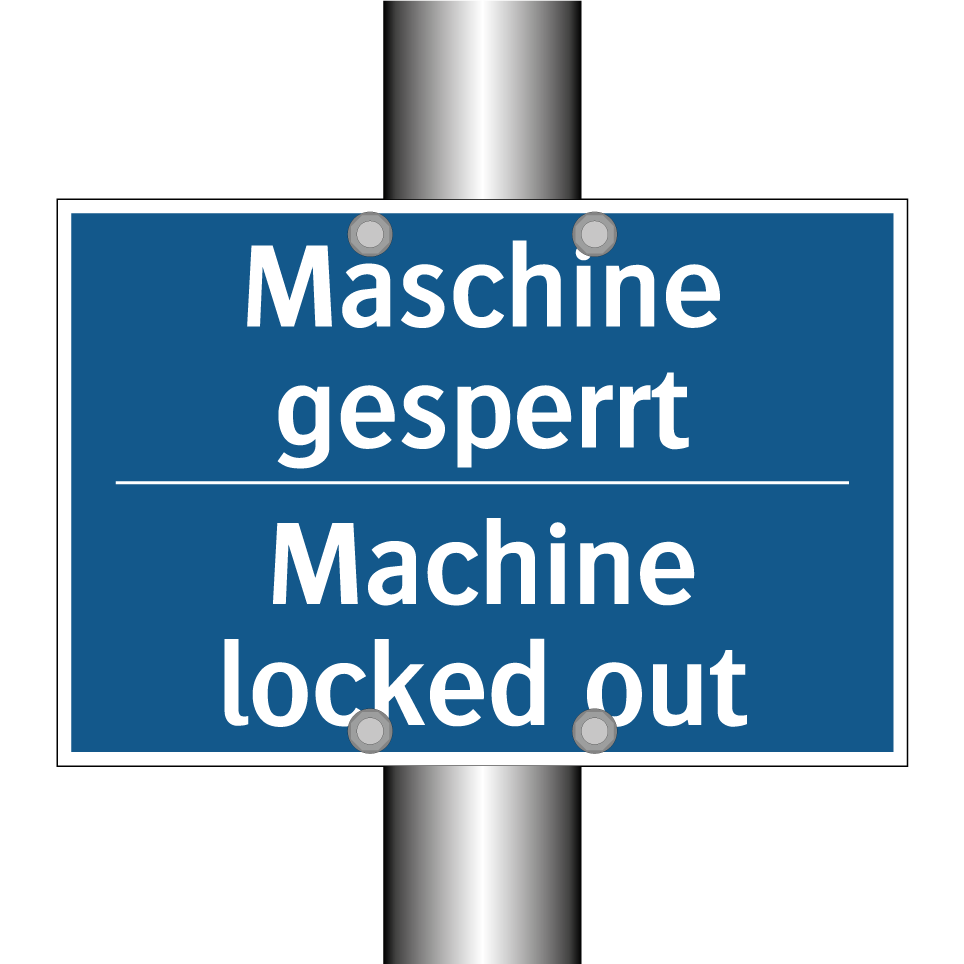 Zweisprachiges Verbotsschild mit deutschem Text Maschine gesperrt und englischem Text Machine locked out