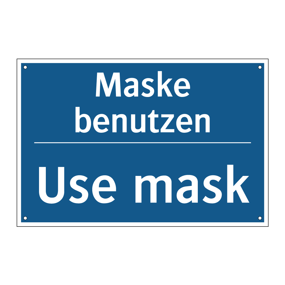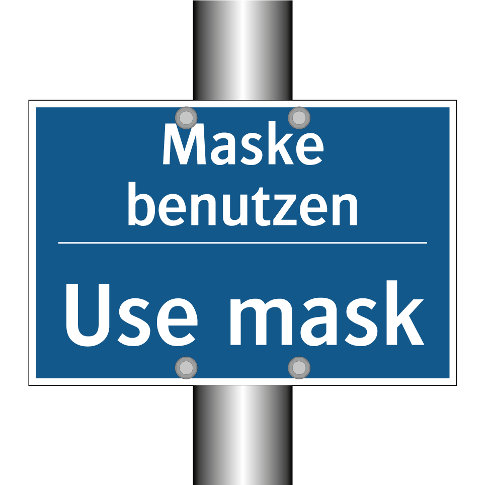 Zweisprachiges Verbotsschild mit deutschem Text Maske benutzen und englischem Text Use mask