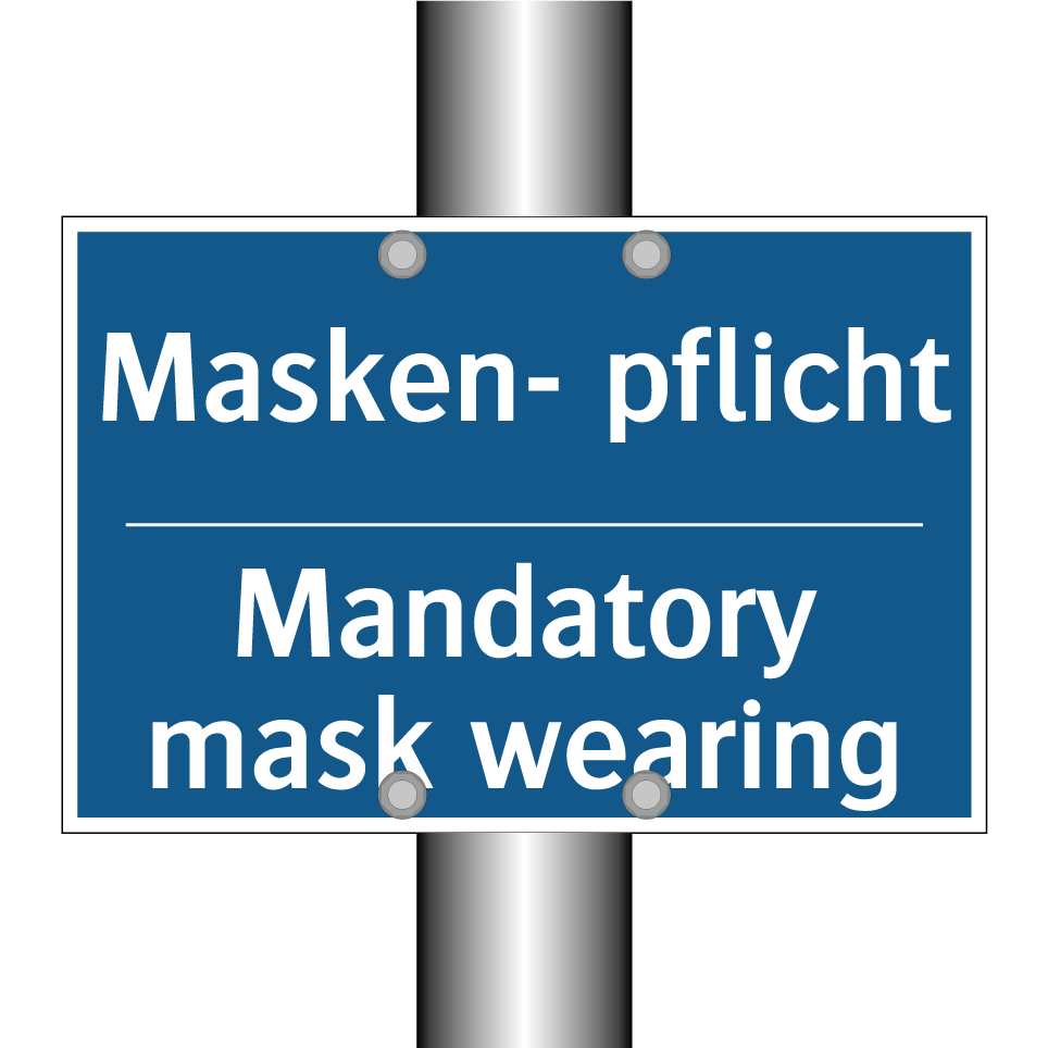 Zweisprachiges Verbotsschild mit deutschem Text Masken- pflicht und englischem Text Mandatory mask wearing