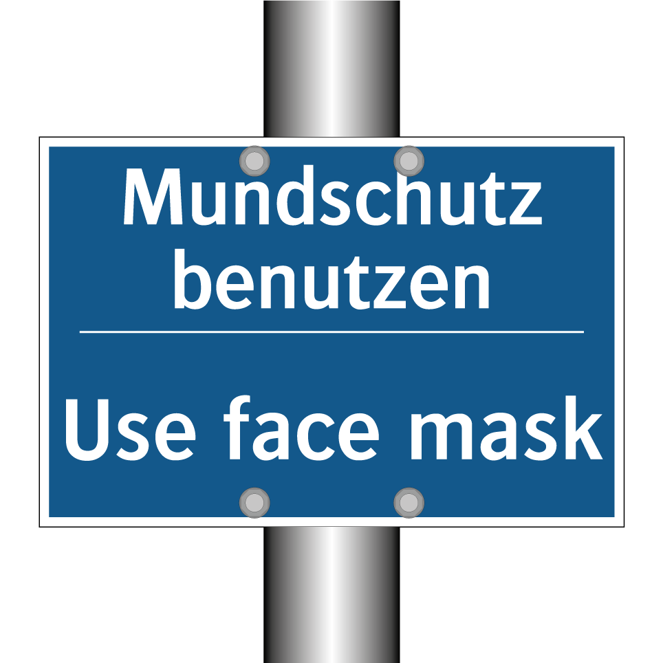 Zweisprachiges Verbotsschild mit deutschem Text Mundschutz benutzen und englischem Text Use face mask