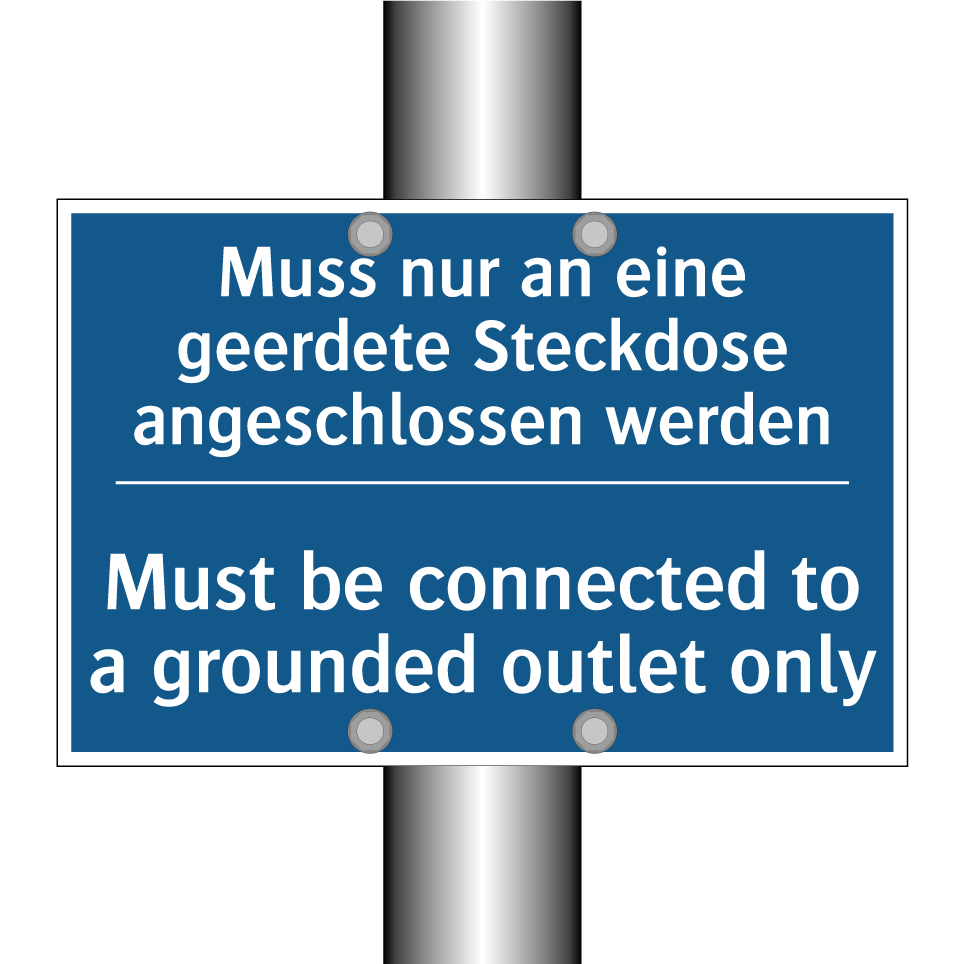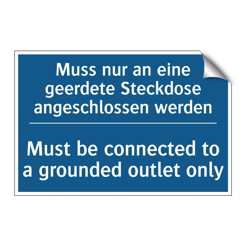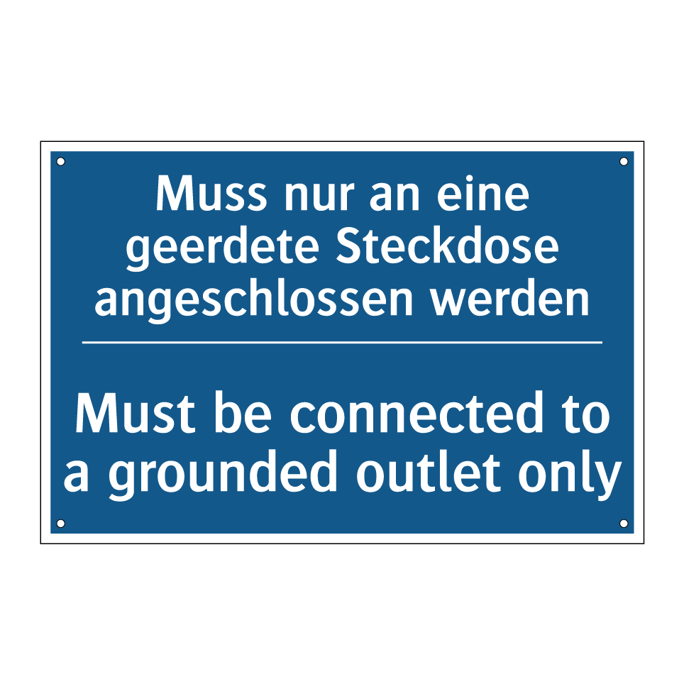 Zweisprachiges Verbotsschild mit deutschem Text Muss nur an eine geerdete Steckdose angeschlossen werden und englischem Text Must be connected to a grounded outlet only