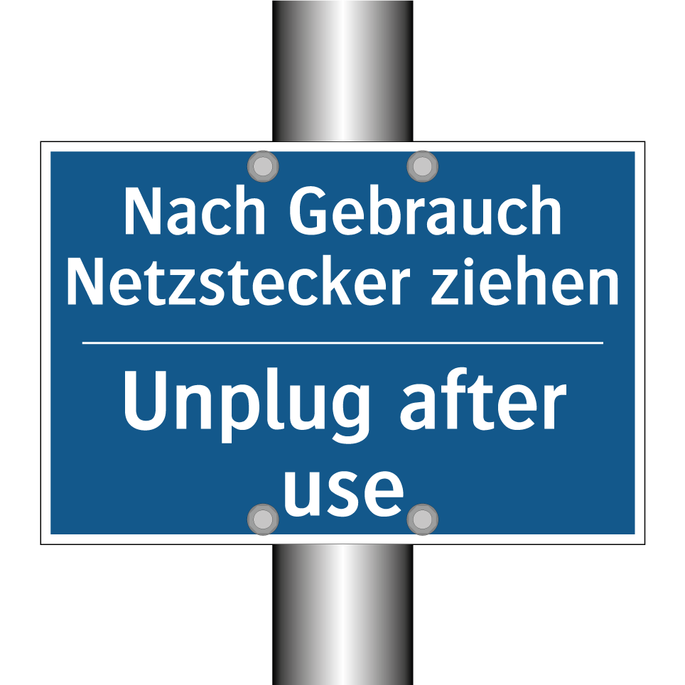 Zweisprachiges Verbotsschild mit deutschem Text Nach Gebrauch Netzstecker ziehen und englischem Text Unplug after use
