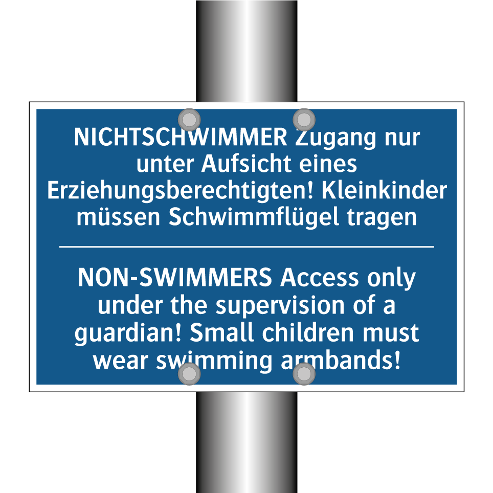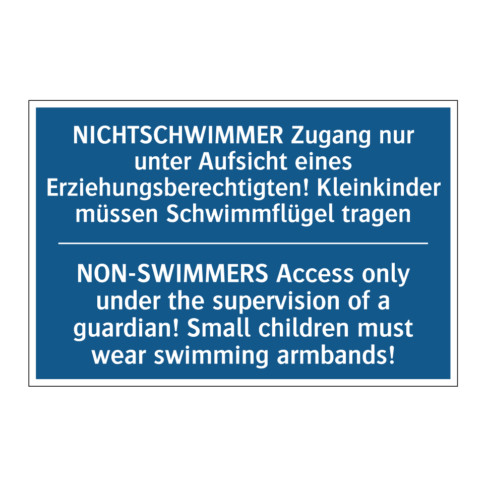 Zweisprachiges Verbotsschild mit deutschem Text NICHTSCHWIMMER Zugang nur unter Aufsicht eines Erziehungsberechtigten! Kleinkinder müssen Schwimmflügel tragen und englischem Text NON-SWIMMERS Access only under the supervision of a guardian! Small children must wear swimming armbands!