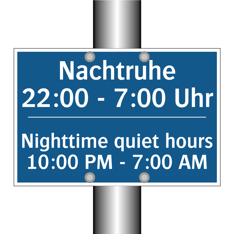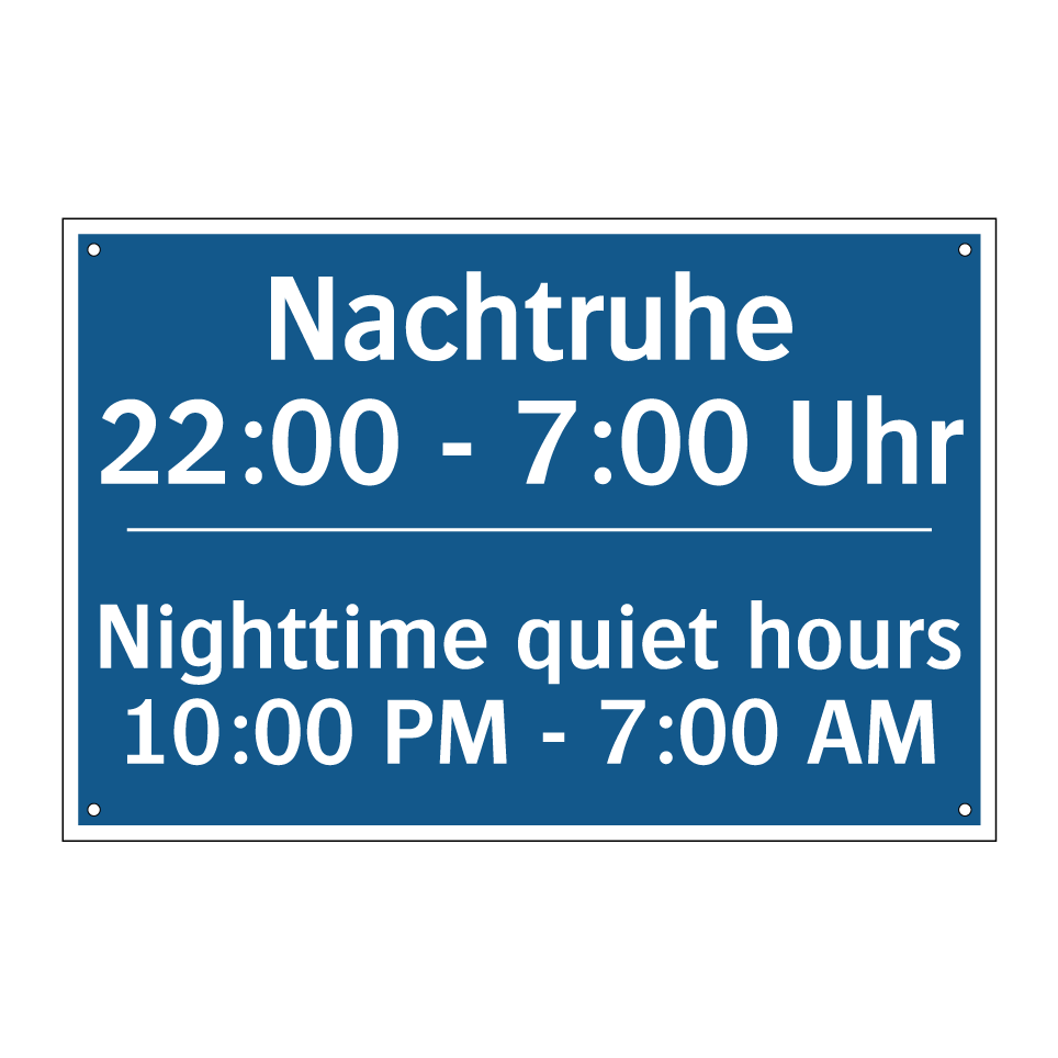 Zweisprachiges Verbotsschild mit deutschem Text Nachtruhe 22:00 - 7:00 Uhr und englischem Text Nighttime quiet hours 10:00 PM - 7:00 AM