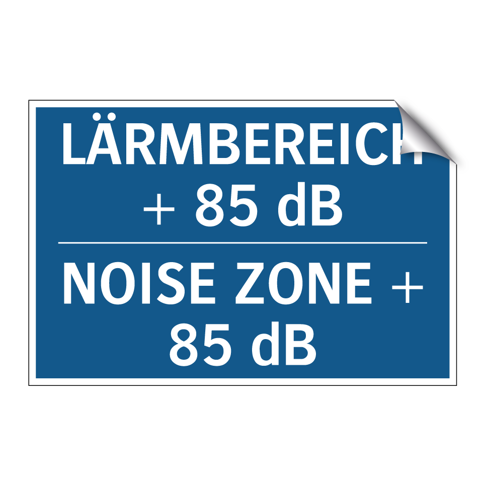 Zweisprachiges Verbotsschild mit deutschem Text LÄRMBEREICH + 85 dB und englischem Text NOISE ZONE + 85 dB