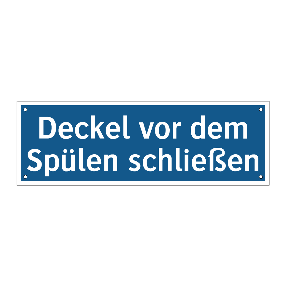 Gebotsschild mit dem Text Deckel vor dem Spülen schließen