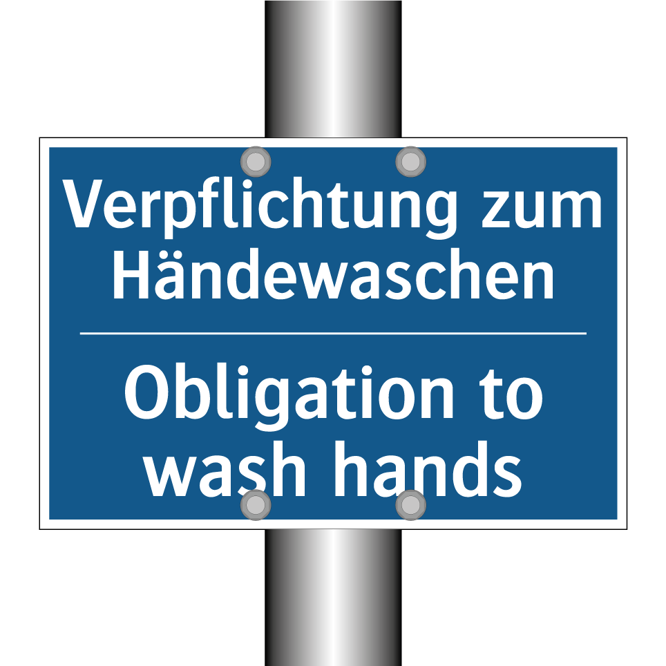 Zweisprachiges Verbotsschild mit deutschem Text Verpflichtung zum Händewaschen und englischem Text Obligation to wash hands
