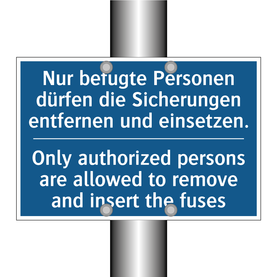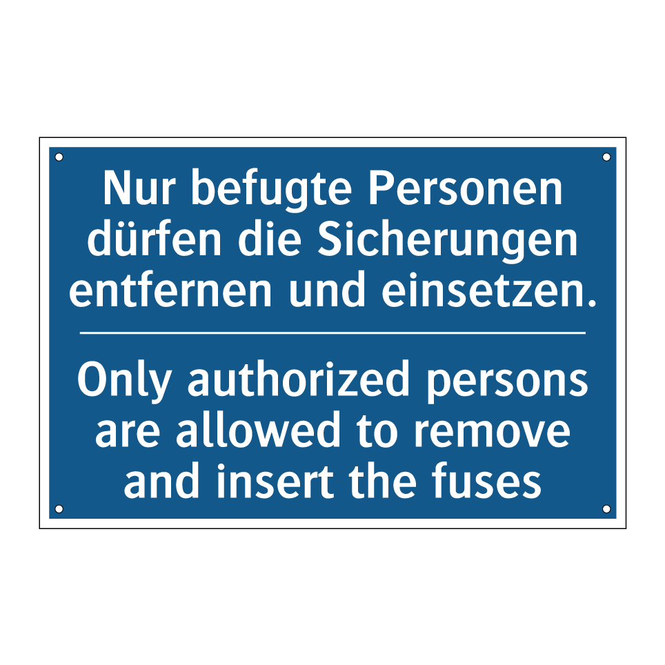 Zweisprachiges Verbotsschild mit deutschem Text Nur befugte Personen dürfen die Sicherungen entfernen und einsetzen. und englischem Text Only authorized persons are allowed to remove and insert the fuses