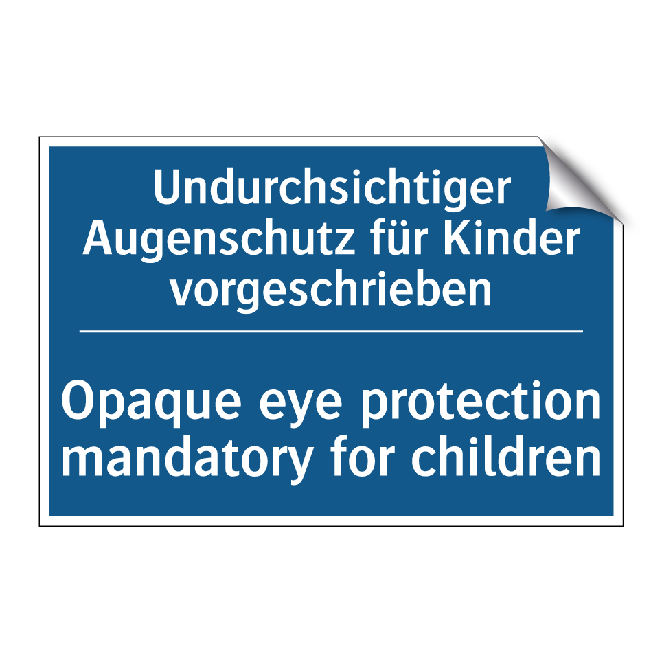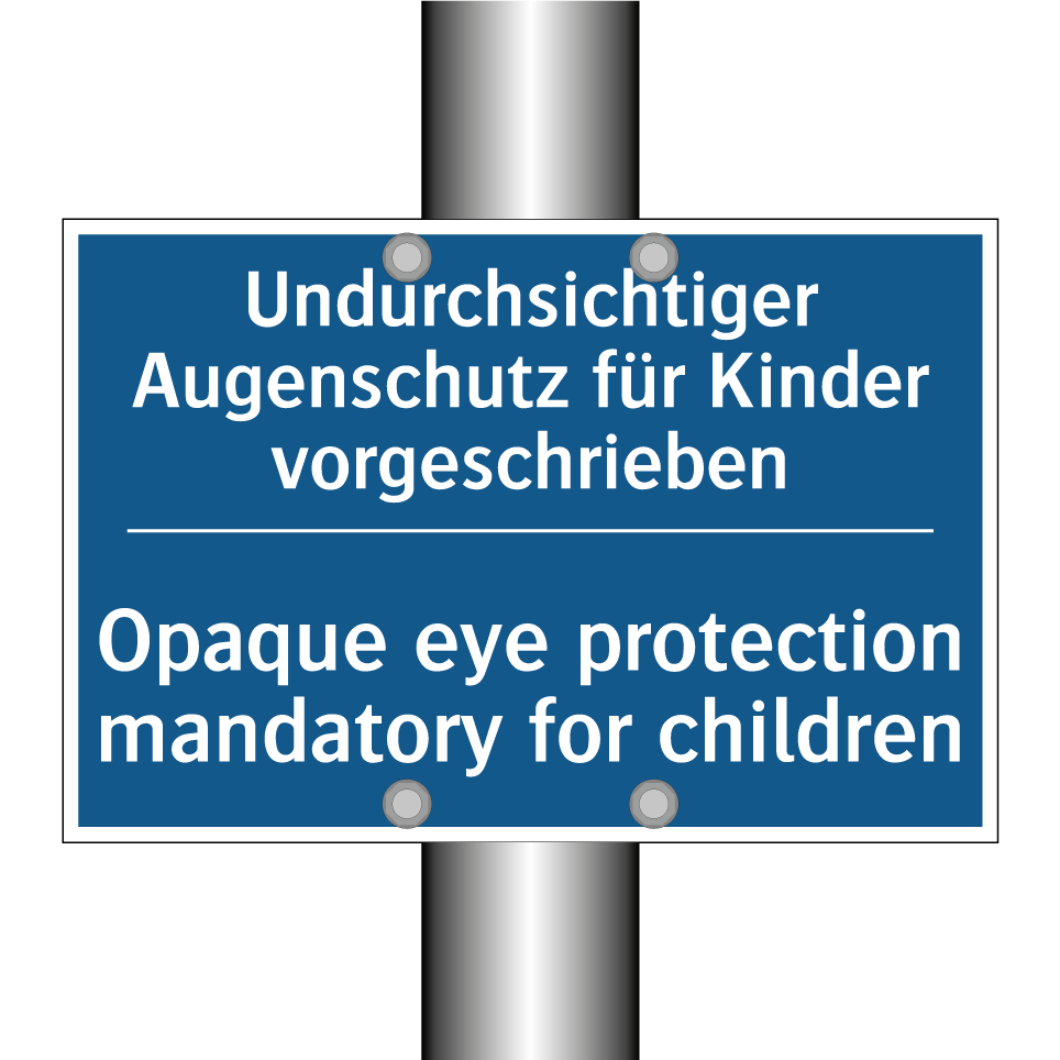 Zweisprachiges Verbotsschild mit deutschem Text Undurchsichtiger Augenschutz für Kinder vorgeschrieben und englischem Text Opaque eye protection mandatory for children