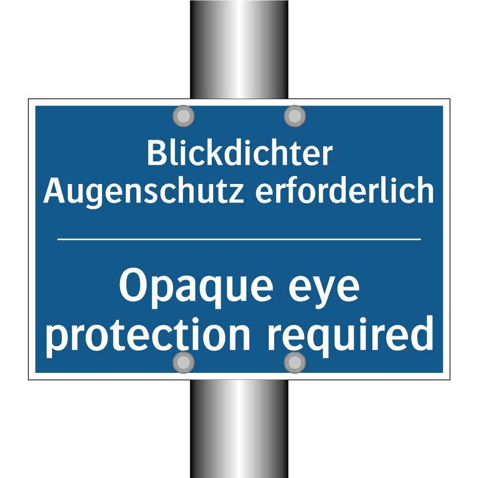 Zweisprachiges Verbotsschild mit deutschem Text Blickdichter Augenschutz erforderlich und englischem Text Opaque eye protection required