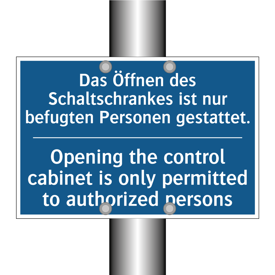 Zweisprachiges Verbotsschild mit deutschem Text Das Öffnen des Schaltschrankes ist nur befugten Personen gestattet. und englischem Text Opening the control cabinet is only permitted to authorized persons