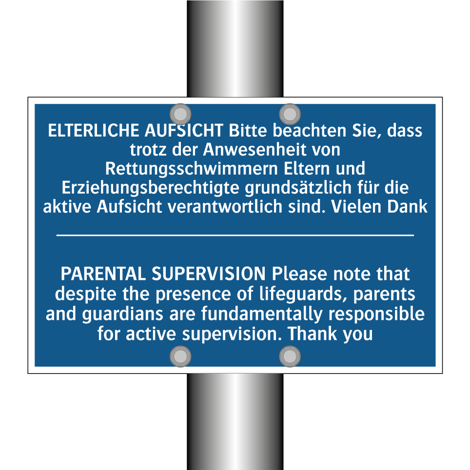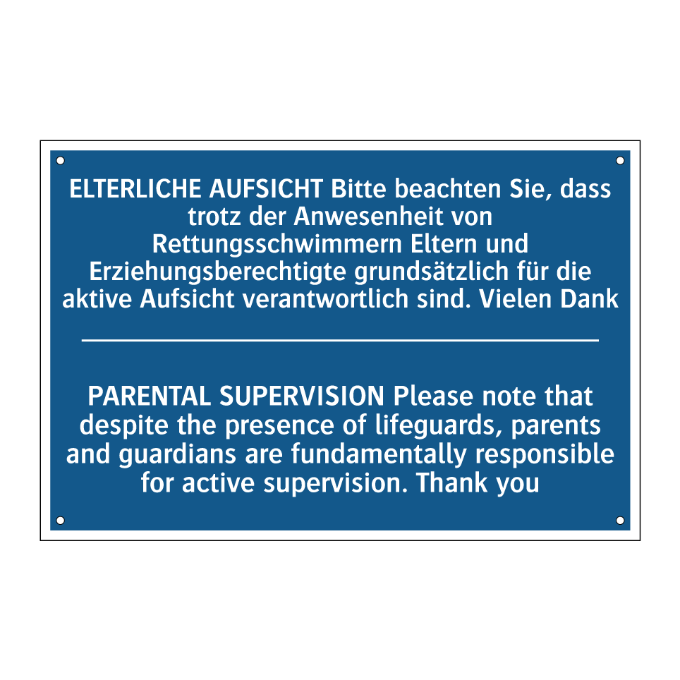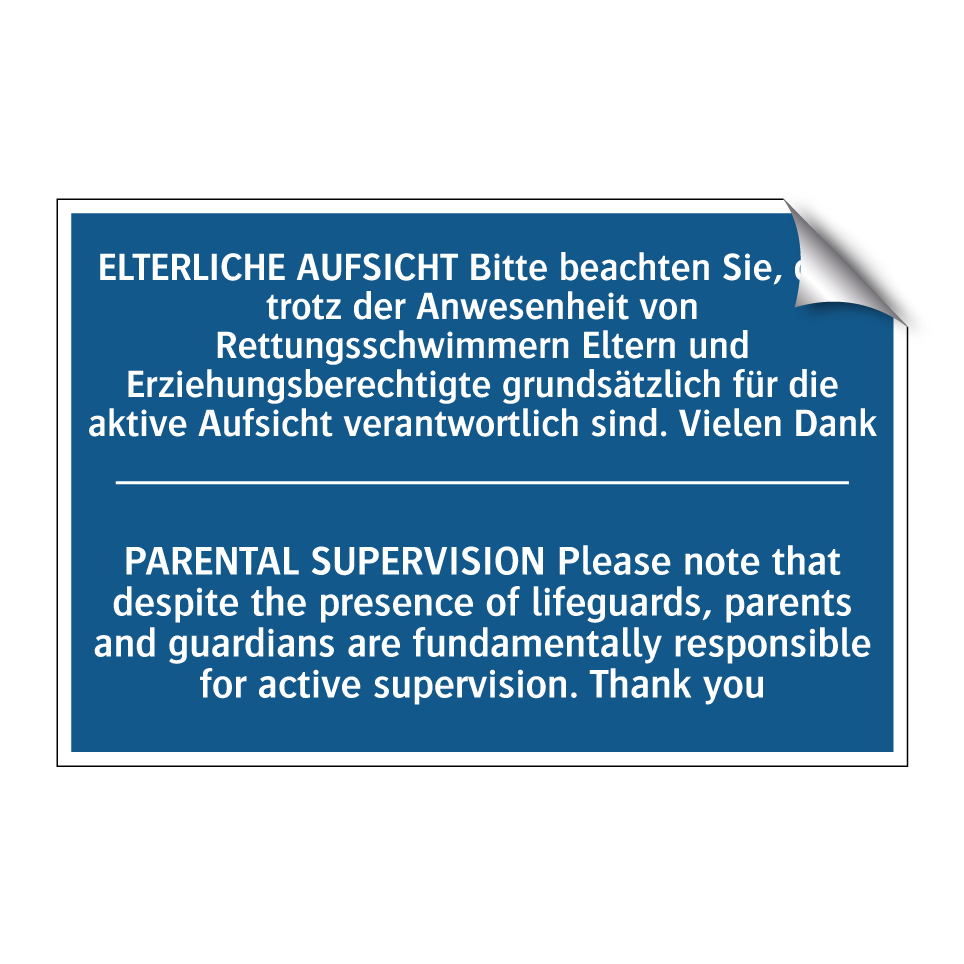 Zweisprachiges Verbotsschild mit deutschem Text ELTERLICHE AUFSICHT Bitte beachten Sie, dass trotz der Anwesenheit von Rettungsschwimmern Eltern und Erziehungsberechtigte grundsätzlich für die aktive Aufsicht verantwortlich sind. Vielen Dank und englischem Text PARENTAL SUPERVISION Please note that despite the presence of lifeguards, parents and guardians are fundamentally responsible for active supervision. Thank you