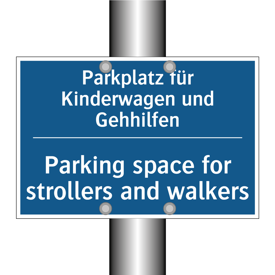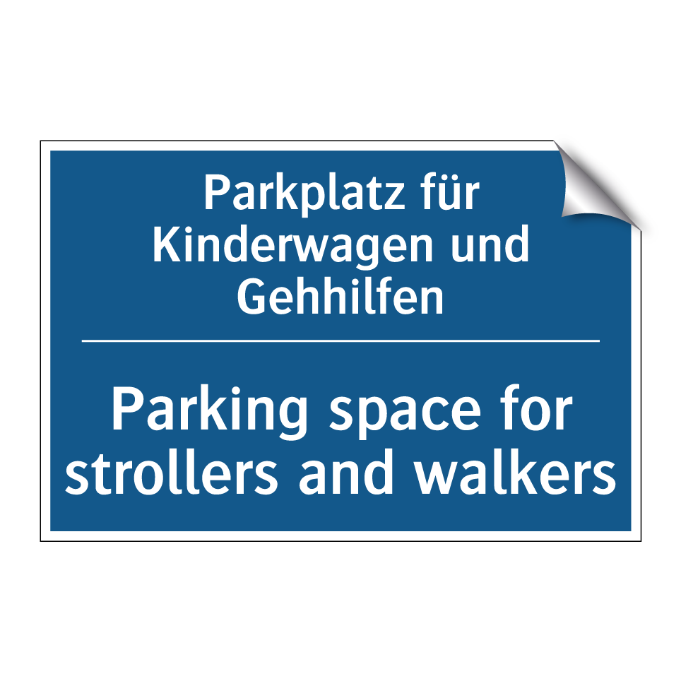 Zweisprachiges Verbotsschild mit deutschem Text Parkplatz für Kinderwagen und Gehhilfen und englischem Text Parking space for strollers and walkers