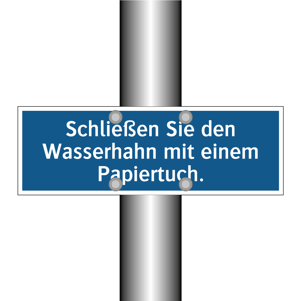 Gebotsschild mit dem Text Schließen Sie den Wasserhahn mit einem Papiertuch.