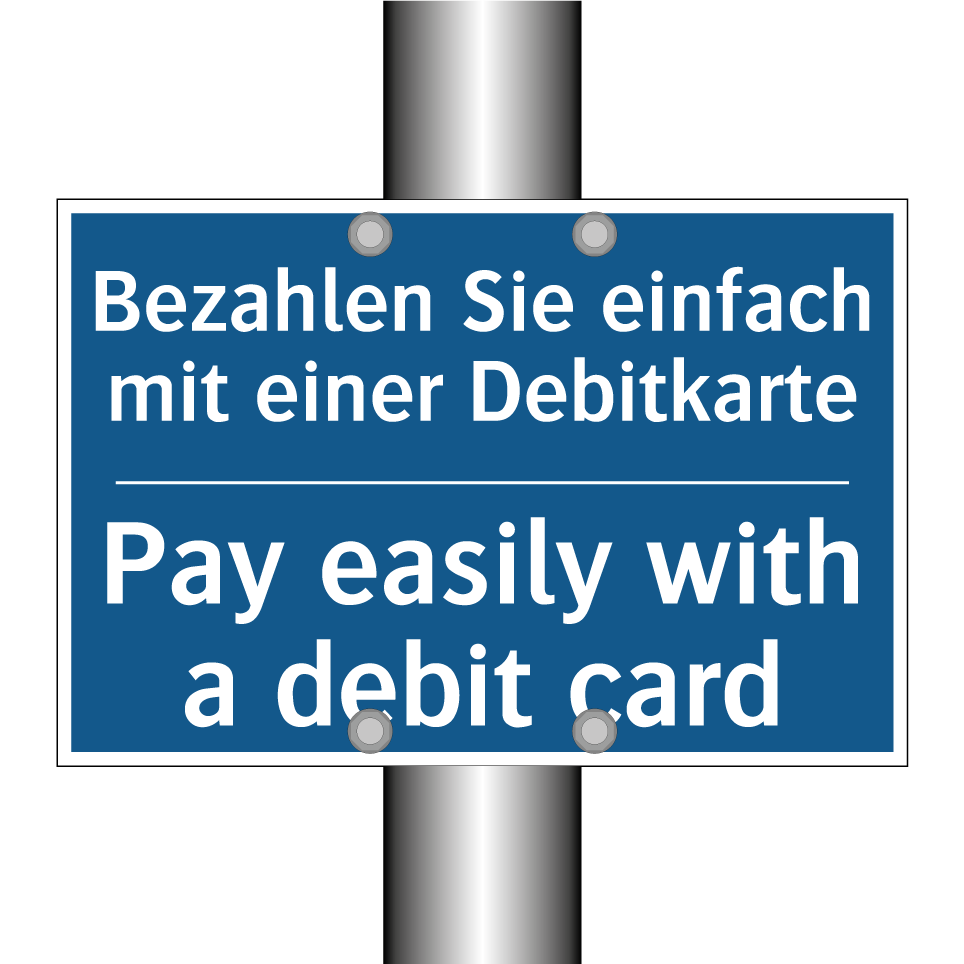 Zweisprachiges Verbotsschild mit deutschem Text Bezahlen Sie einfach mit einer Debitkarte und englischem Text Pay easily with a debit card