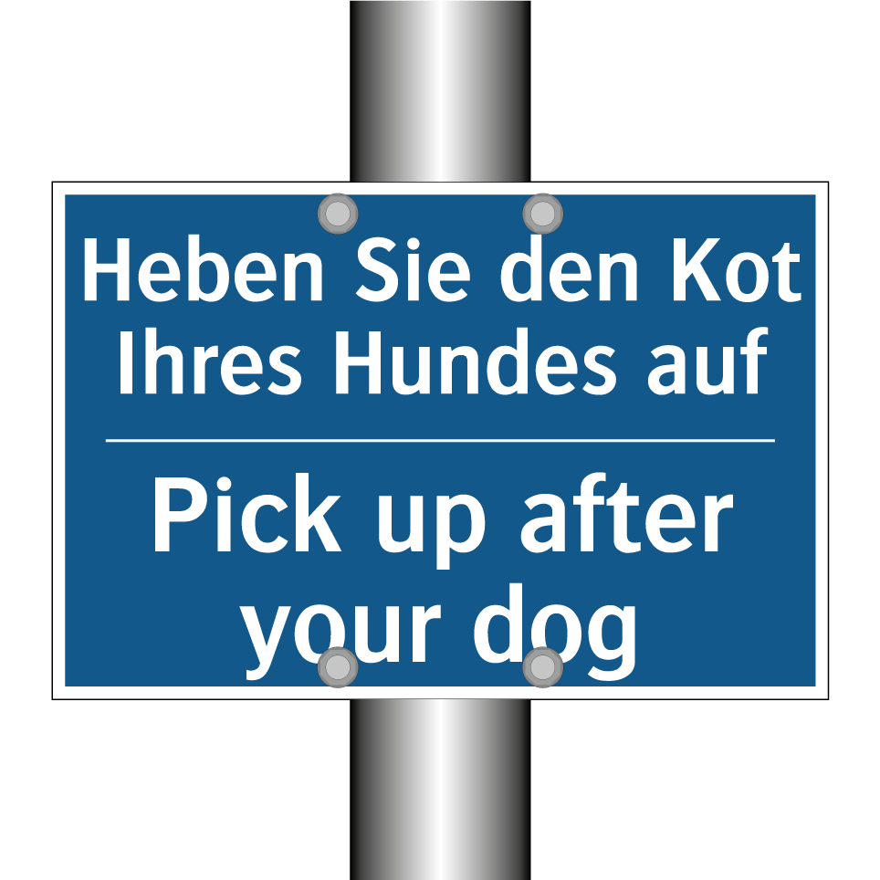 Zweisprachiges Verbotsschild mit deutschem Text Heben Sie den Kot Ihres Hundes auf und englischem Text Pick up after your dog