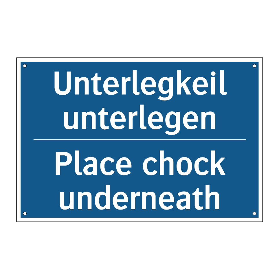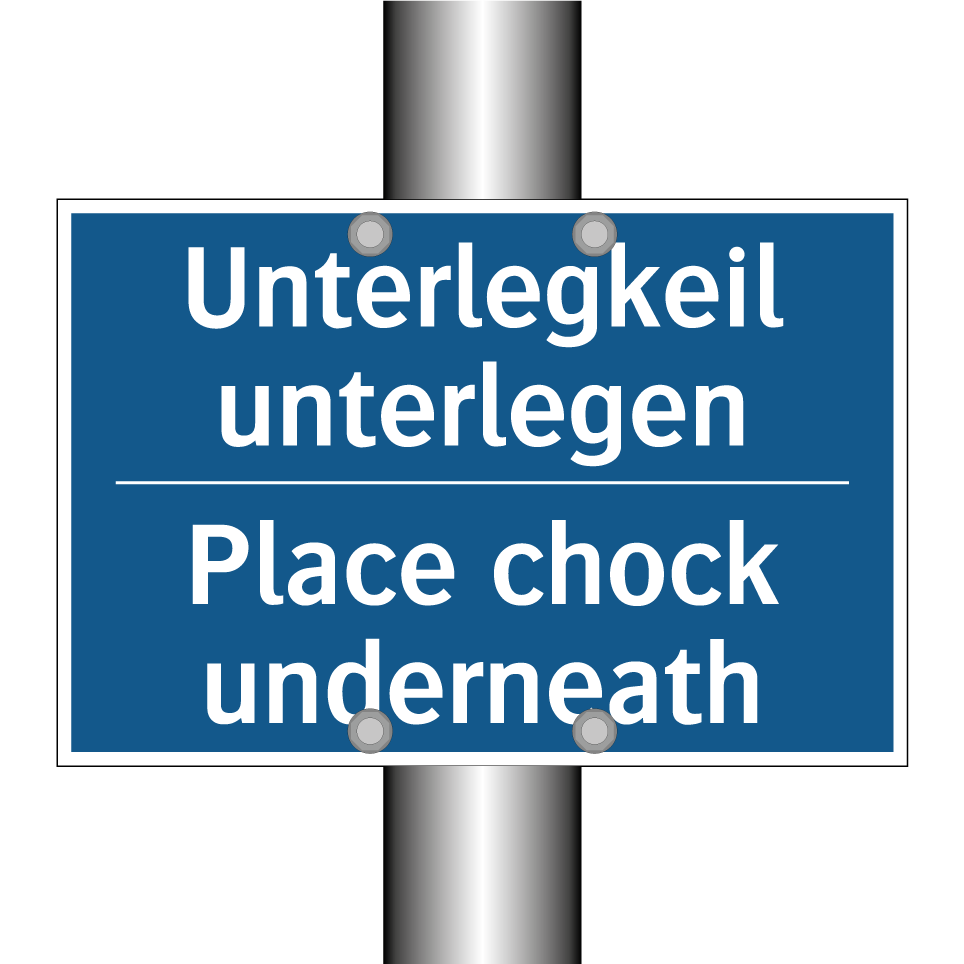 Zweisprachiges Verbotsschild mit deutschem Text Unterlegkeil unterlegen und englischem Text Place chock underneath