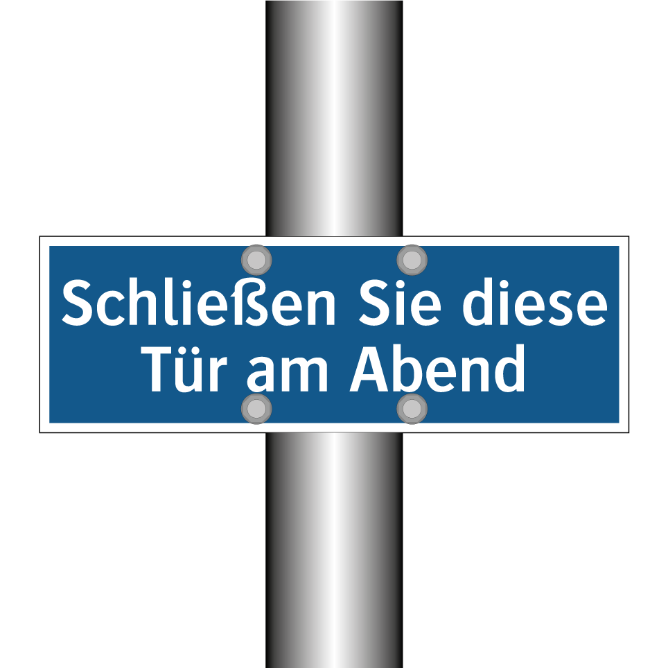 Diese Gebotsschild mit blauem Hintergrund und weißer Schrift ist ideal für den Einsatz in Bereichen, in denen es wichtig ist, Türen am Abend zu schließen. Sie dient als klare Erinnerung und fördert die Sicherheit und den Schutz von Räumlichkeiten. Diese Anweisungstafel kann in Bürogebäuden, Wohnanlagen oder öffentlichen Einrichtungen angebracht werden, um sicherzustellen, dass alle Türen ordnungsgemäß verschlossen werden. Durch die strategische Platzierung an Eingängen oder Fluren wird die Einhaltung der Sicherheitsvorschriften gefördert. Diese Gebotsschild ist ein unverzichtbares Element für jeden Ort, an dem Sicherheit und Ordnung Priorität haben.