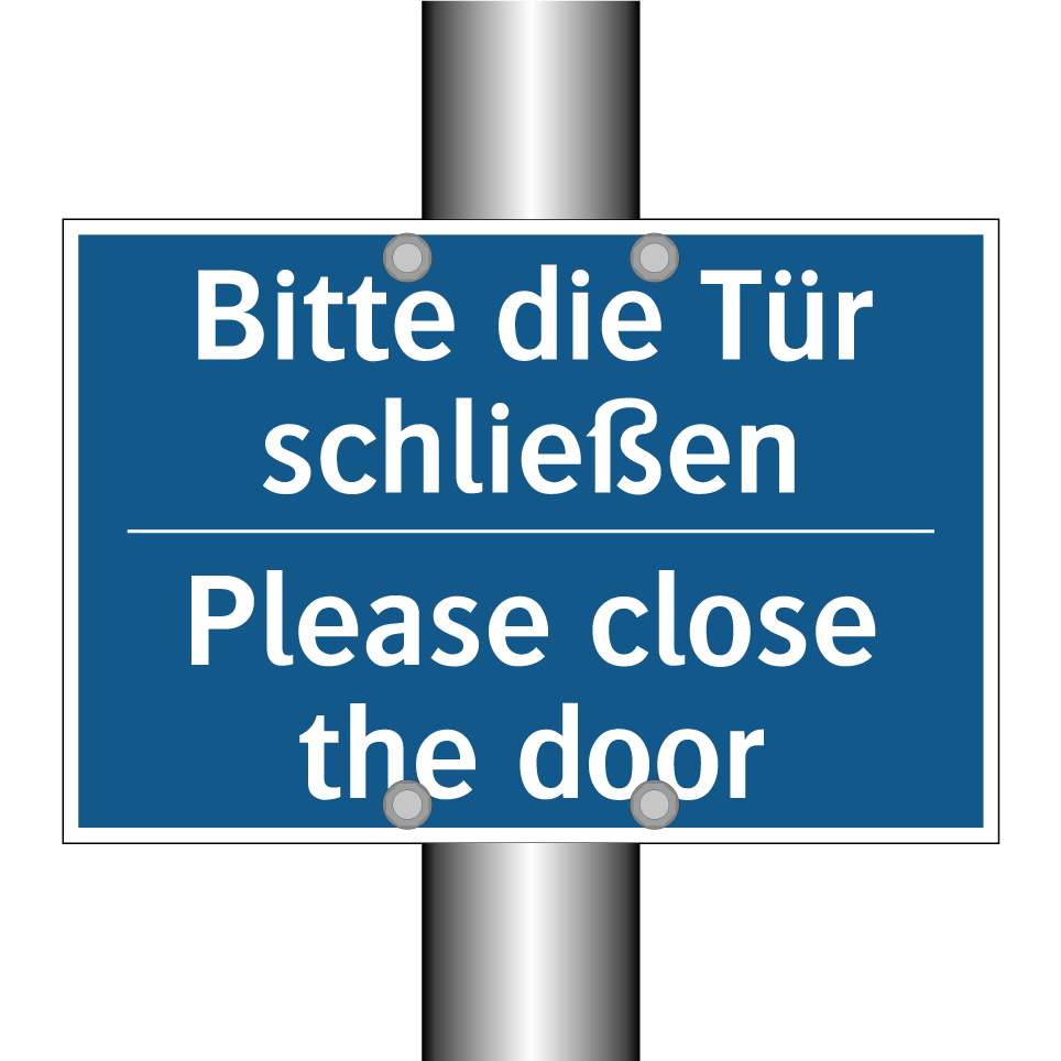 Zweisprachiges Verbotsschild mit deutschem Text Bitte die Tür schließen und englischem Text Please close the door